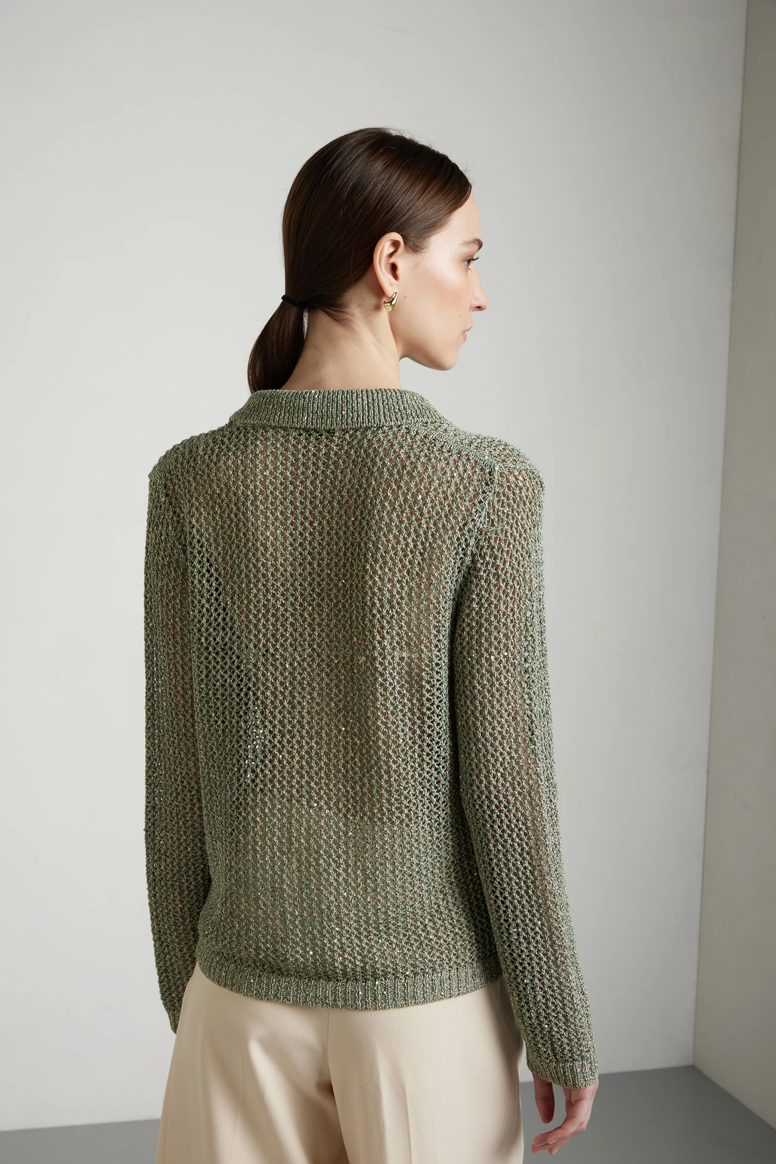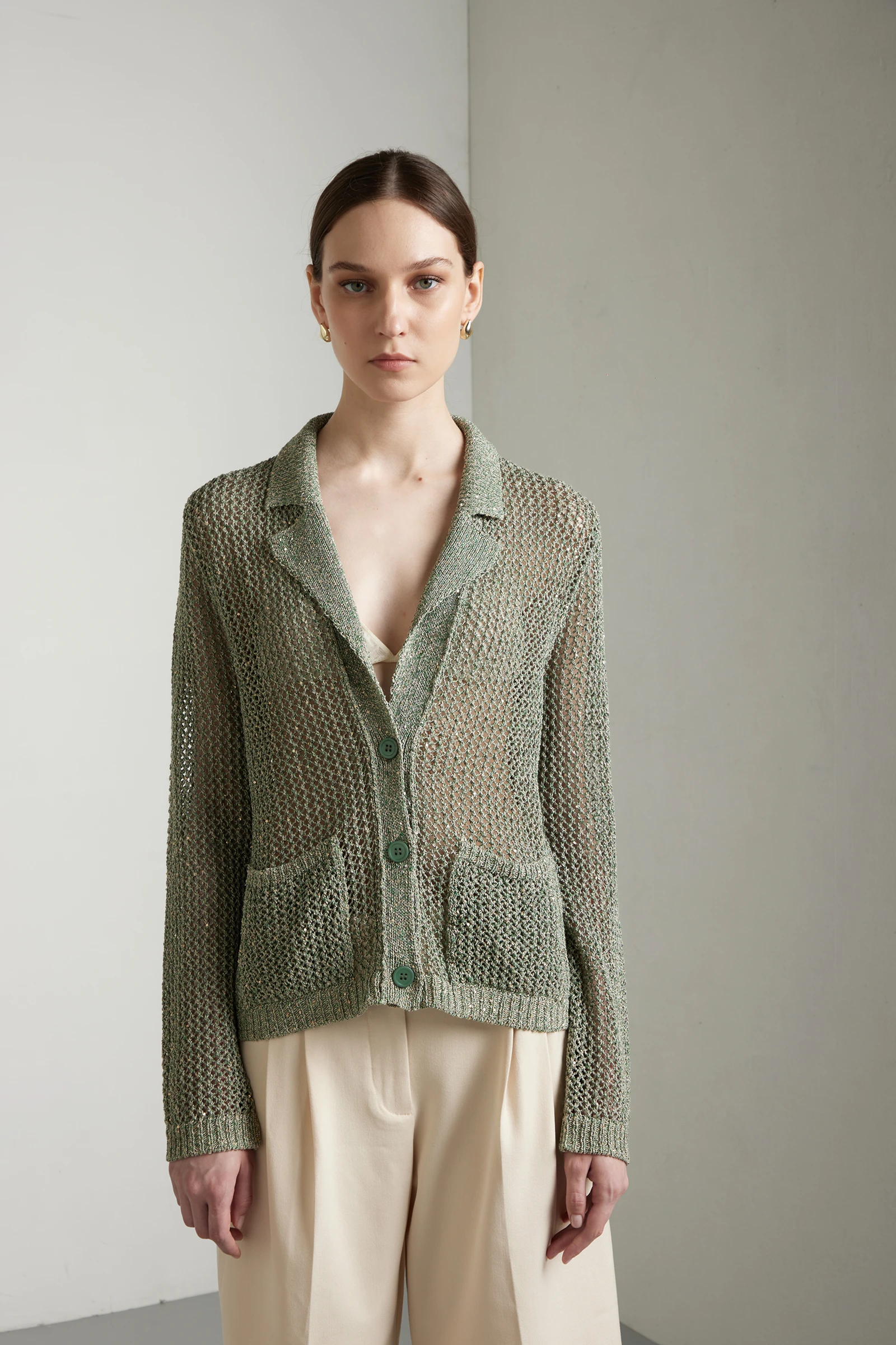 Blazer con collo a rever, realizzato in filato di cotone-viscosa con paillettes e lavorazione punto rete, che dona leggerezza visiva e una texture raffinata.La costruzione regular fit garantisce una vestibilità equilibrata, mentre la maglia a rete crea trasparenze controllate e movimento. Completano il capo le tasche applicate e la chiusura con bottoni frontali, per unestetica pulita ma distintiva.Un blazer in maglia dal carattere contemporaneo, ideale da indossare su top o camicie leggere per un look sofisticato, luminoso e adatto alla stagione primaverile-estiva.