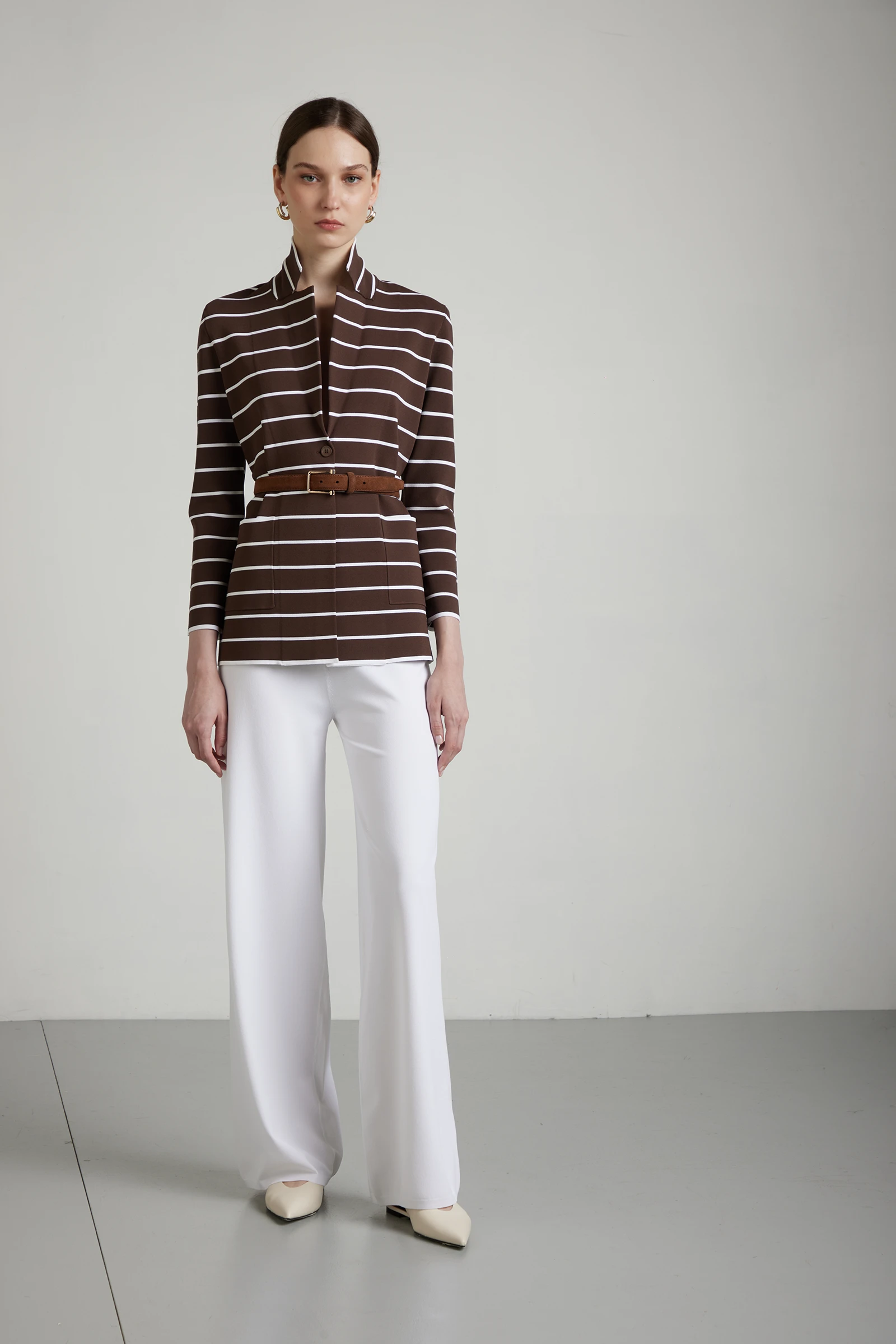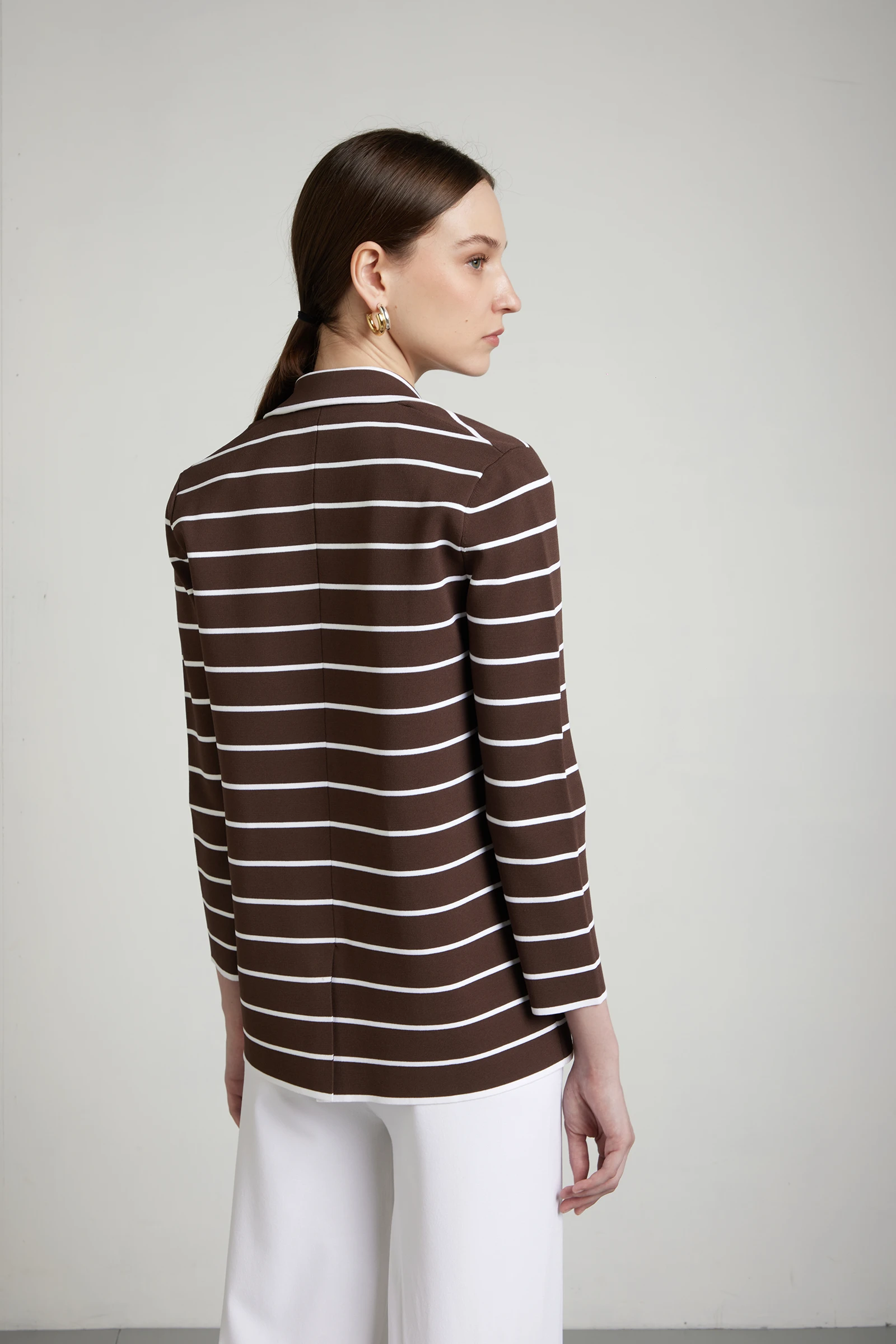 Blazer rigato in viscosa stretch, realizzato in punto Milano e lavorato su finezza 16 per una struttura compatta, stabile e confortevole. Il collo a rever e la chiusura con un bottone definiscono una linea pulita ed essenziale, mentre le tasche applicate aggiungono funzionalità e un dettaglio contemporaneo. La lavorazione punto Milano garantisce maggiore sostegno e tenuta della forma, mantenendo elasticità e comfort grazie alla componente stretch. Un capo versatile e raffinato, ideale per completare look coordinati o abbinato a pantaloni palazzo per uno stile moderno e strutturato.