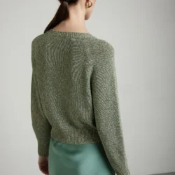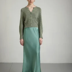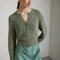 Cardigan corto con scollo coreana e bottoni, realizzato in filato di cotone-viscosa con paillettes che unisce naturalezza e luminosità in modo equilibrato, creando un effetto brillante ma discreto.La manica ampia crea volume e movimento,mantenendo una vestibilità confortevole e ariosa. La struttura del capo resta pulita ed essenziale, bilanciando leffetto brillante del filato con un design sobrio.