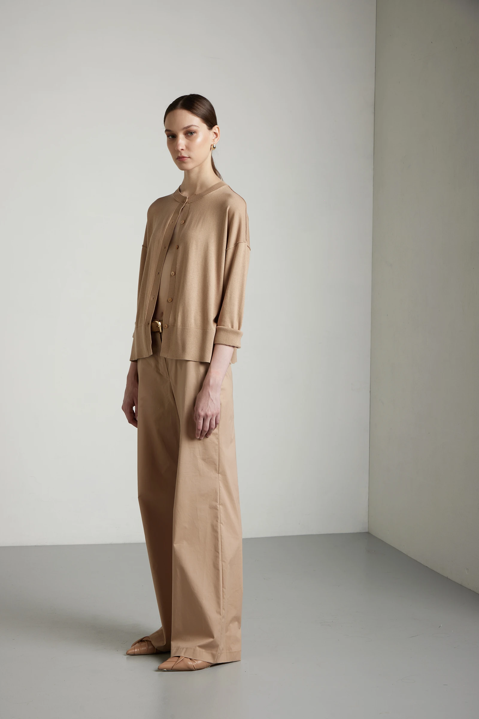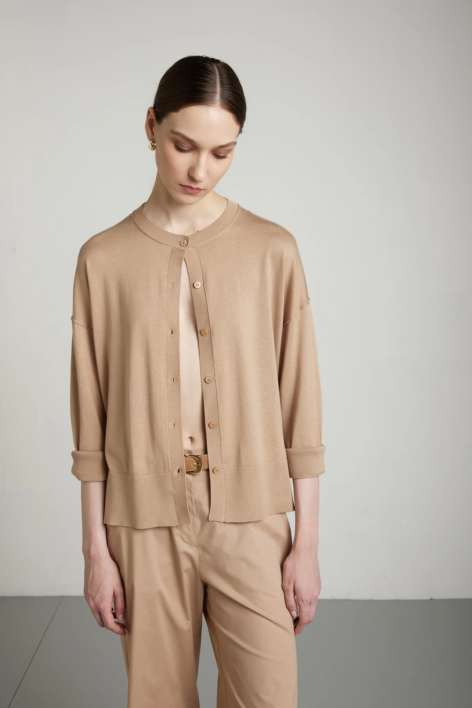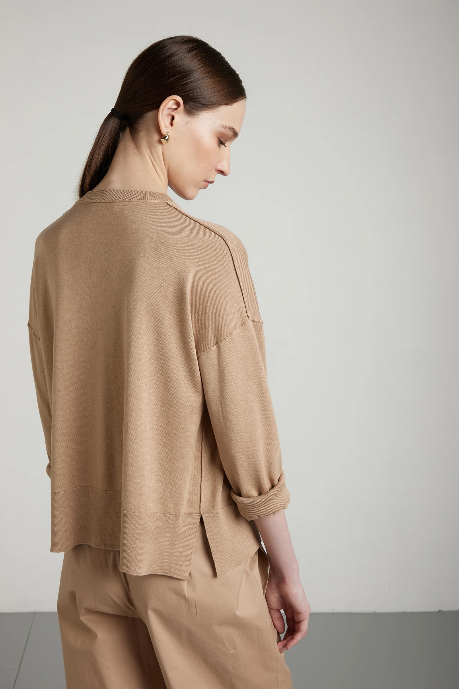 Giacca rasata, oversize, con scollo coreana e bottoni in tinta, realizzata in filato di seta-cotone lavorato su finezza 14, ideale per la stagione primaverile. La combinazione di seta e cotone unisce luminosità naturale, freschezza e traspirabilità, offrendo una mano morbida e raffinata. La lavorazione rasata garantisce una superficie liscia e pulita, valorizzando la qualità del filato. Gli spacchi laterali alleggeriscono la linea e migliorano la vestibilità, donando movimento e comfort. Un capo essenziale ed elegante, perfetto per look primaverili curati e versatili.