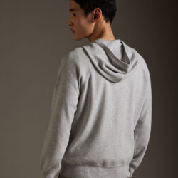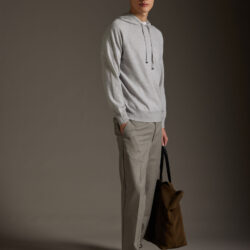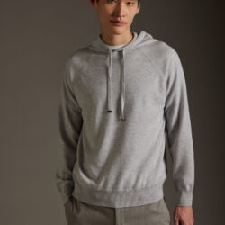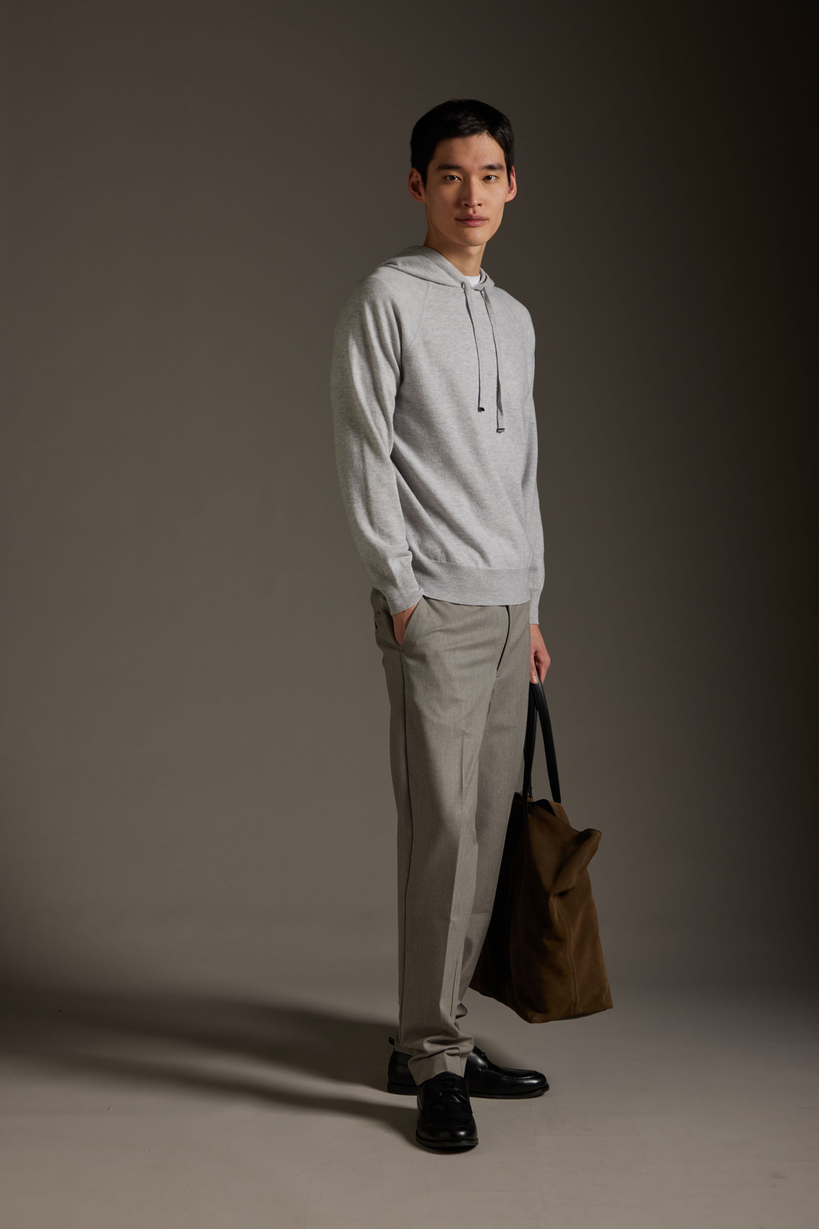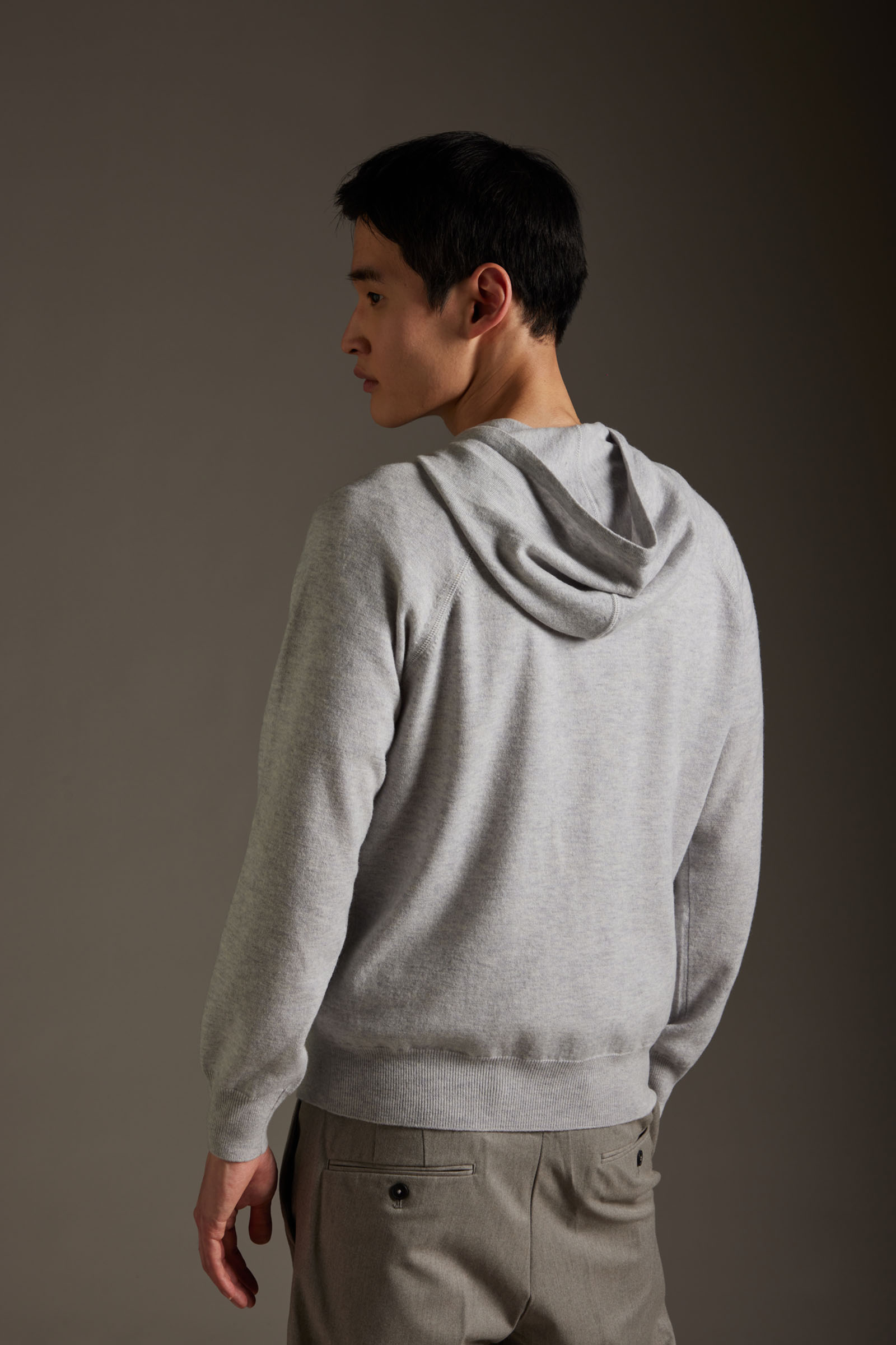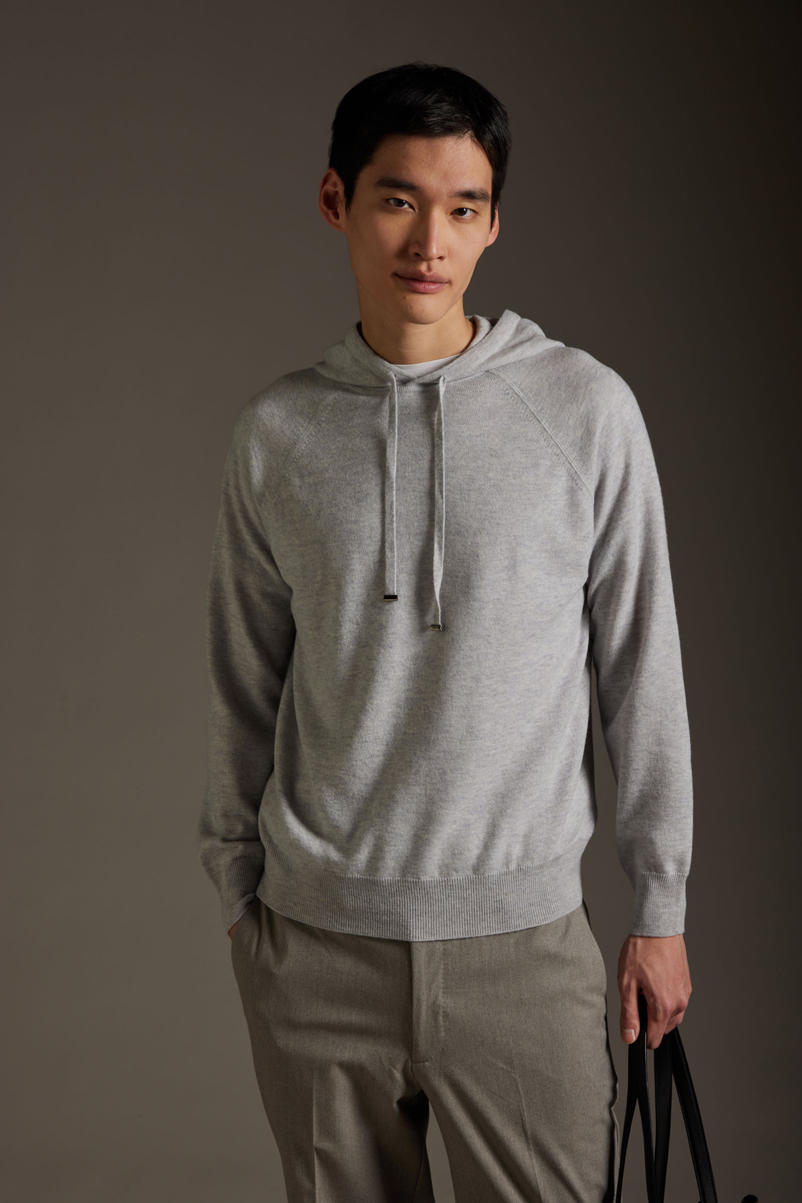 Girocollo con cappuccio taglio felpa rasato calato, con manica a raglan, triangolo e coprenti in tono, realizzata su finezza 14 in pura Lana Merino Extrafine cardata, vestibilità regolare, con fondo polsi e collo a costine