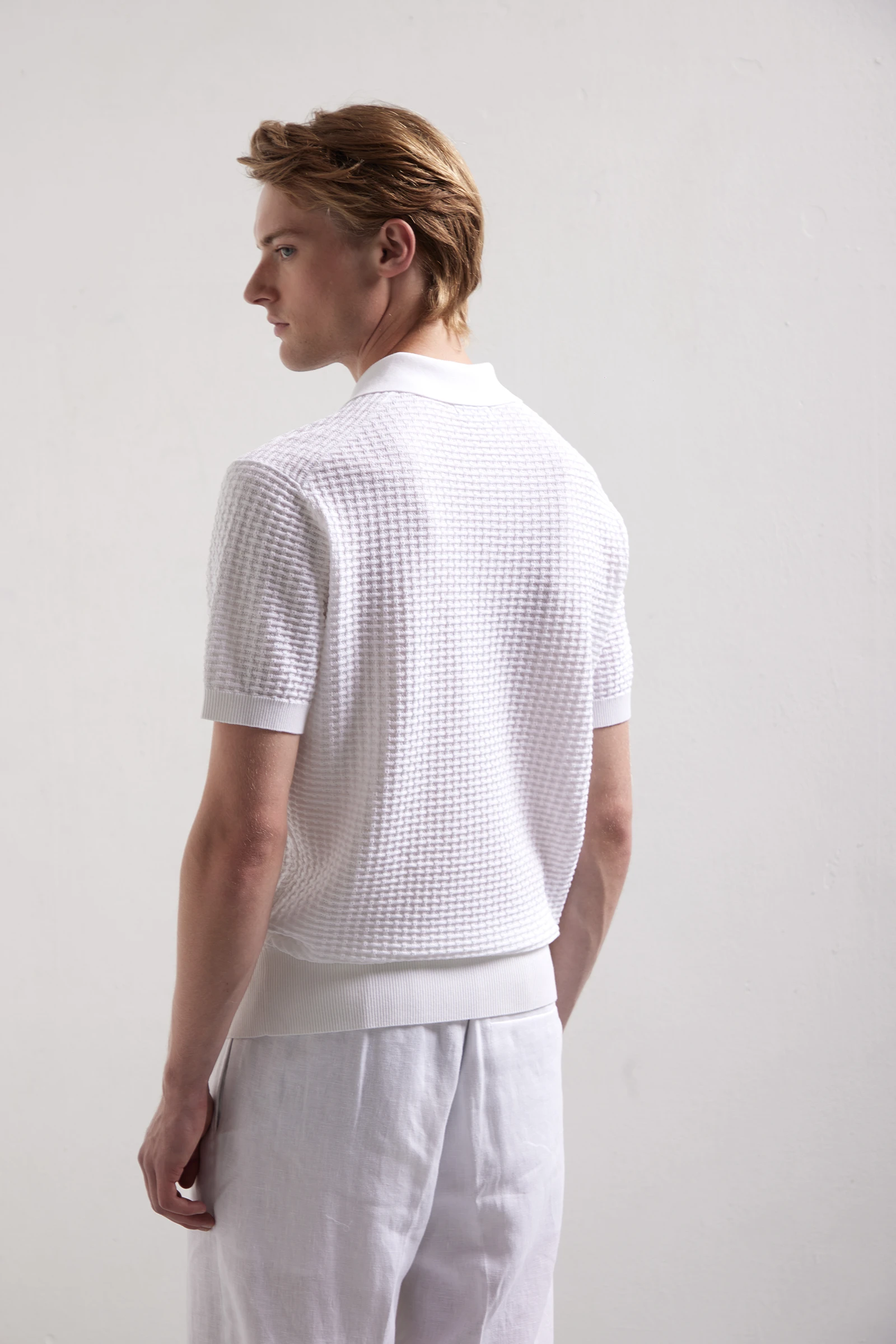 Polo con bottoni a manica corta in puro cotone, realizzato con lavorazione punto alveare che crea una superficie tridimensionale ricca di profondità e movimento. La struttura del punto dona carattere al capo mantenendo freschezza e comfort sulla pelle.