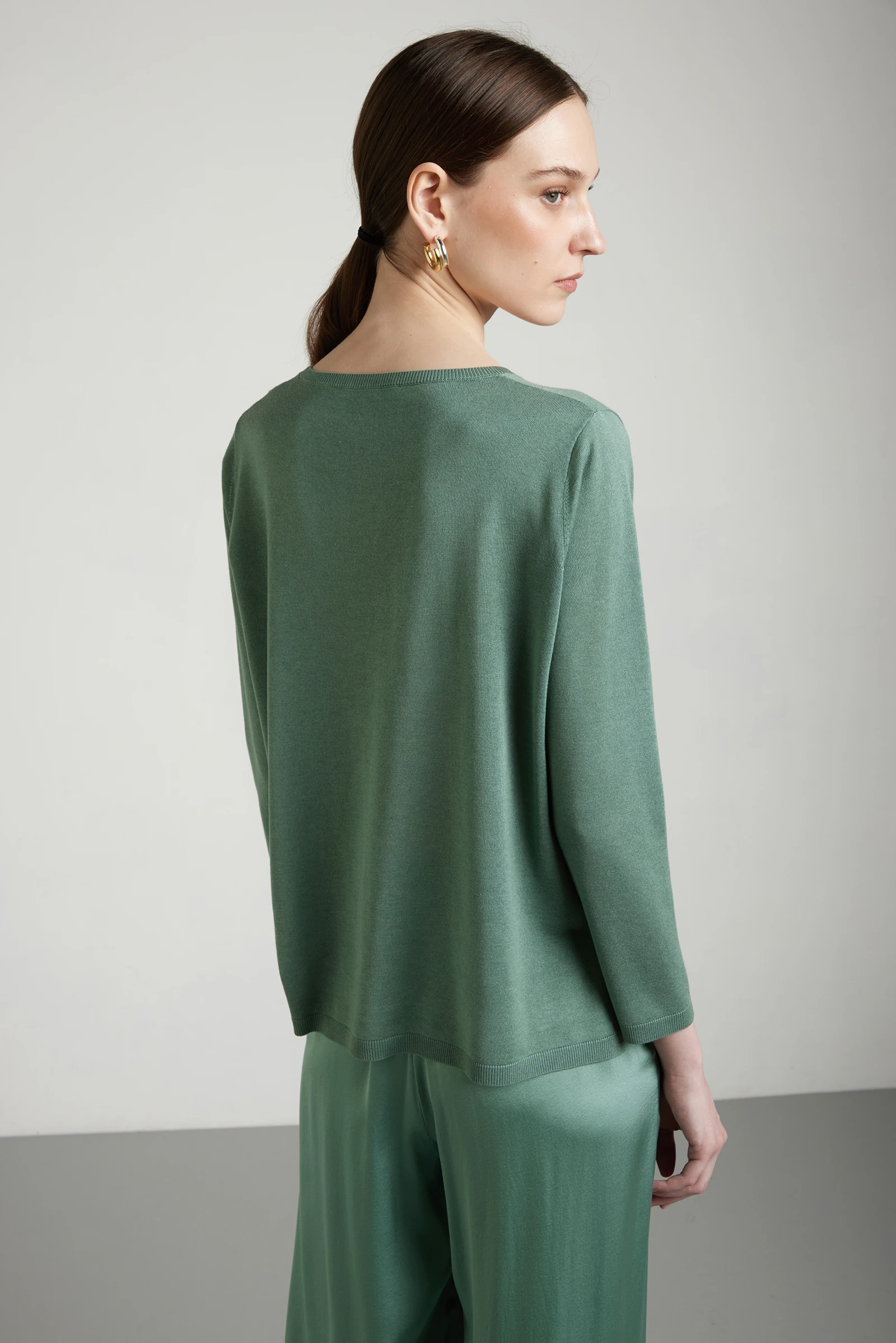 Maglia girocollo dalla linea boxing, realizzata in pregiato filato di seta-cashmere, dalla lavorazione rasata, su finezza 16, per una superficie liscia, compatta e raffinata. La combinazione di seta e cashmere assicura luminosità naturale, morbidezza e leggerezza, offrendo una sensazione confortevole e avvolgente sulla pelle. La costruzione presenta doppia lunghezza, leggermente più estesa sul retro, e spacchi laterali che alleggeriscono la linea e valorizzano la vestibilità fluida. Un capo contemporaneo e sofisticato, ideale per look essenziali ma di alta qualità, perfetto in abbinamento a pantaloni fluidi o denim.