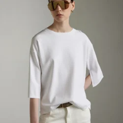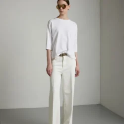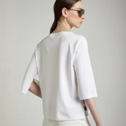 Maglia girocollo dalla linea boxing, realizzata in viscosa stretch lavorata su finezza 16 rasata, per una superficie liscia, compatta e confortevole.La vestibilità è ampia e contemporanea, con volumi dritti che garantiscono libertà di movimento. Gli spacchi laterali alleggeriscono la linea e valorizzano la silhouette, mentre gli spacchi sulle maniche aggiungono un dettaglio moderno e funzionale. Un capo essenziale e versatile, ideale per look puliti e raffinati, perfetto da abbinare a pantaloni fluidi o denim per uno stile quotidiano curato.