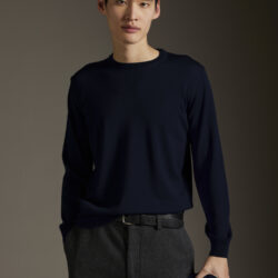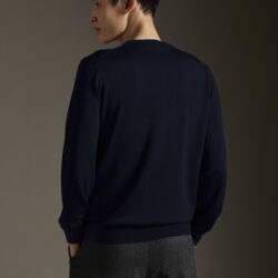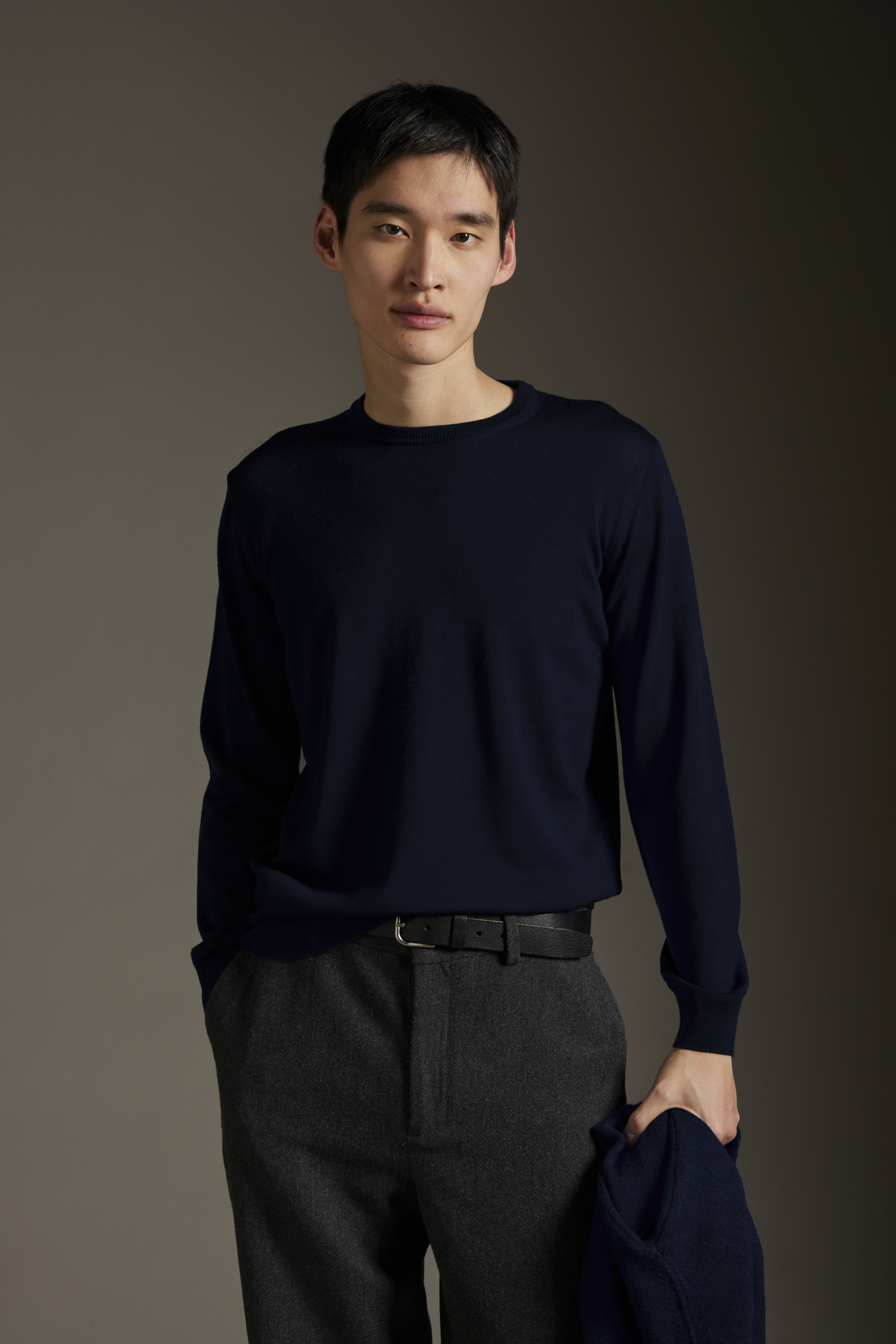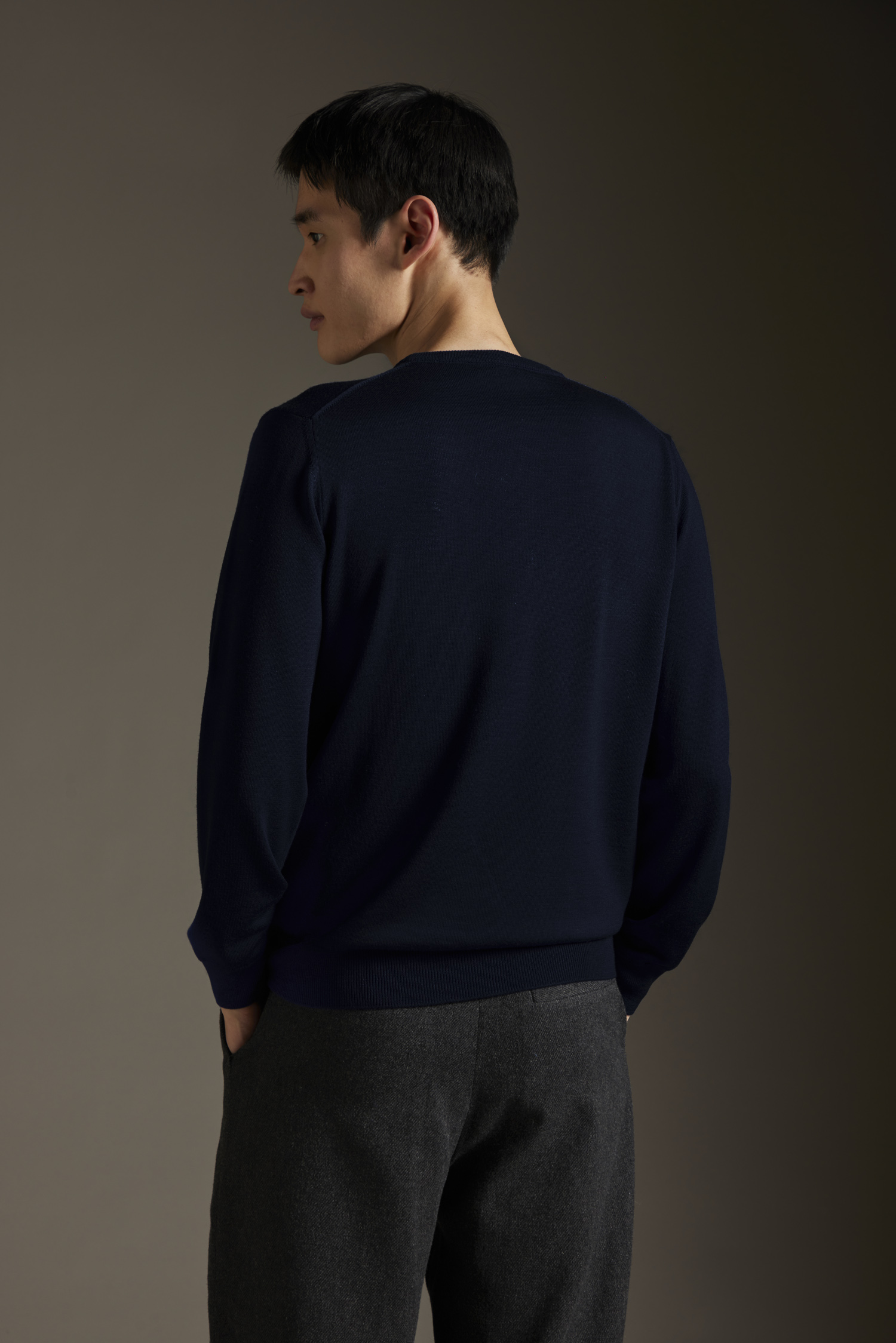 Girocollo rasato calato, realizzata su finezza 14 in pura Lana Merino calda e confortevole, vestibilità regolare, con fondi polsi e collo a costine.