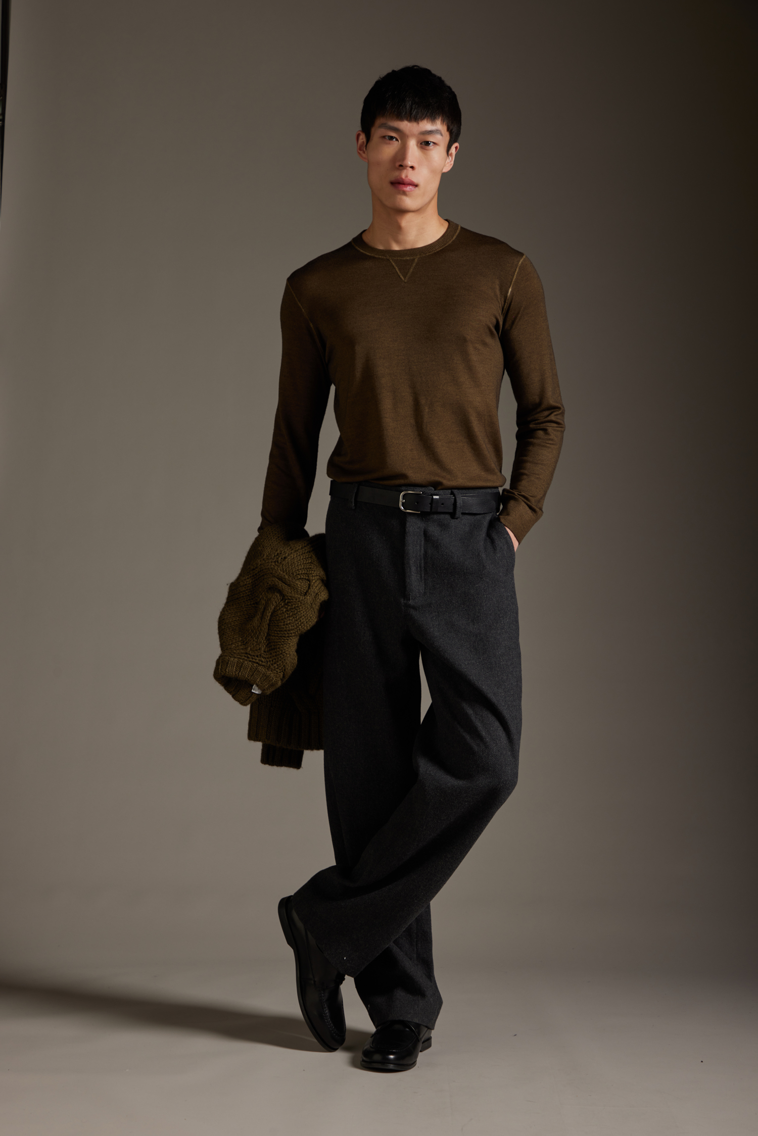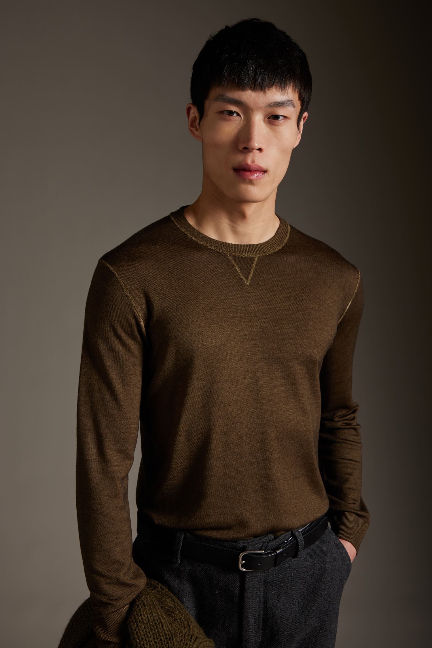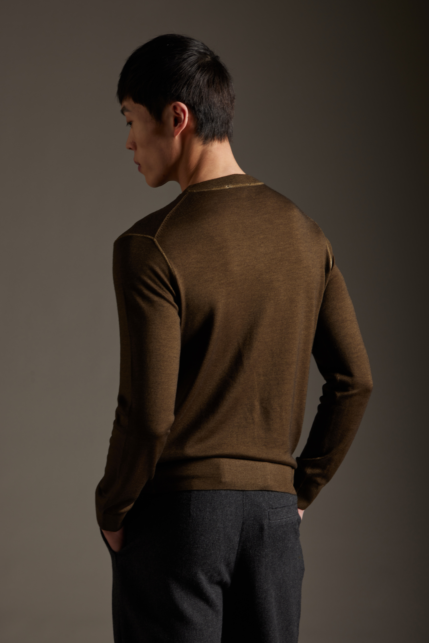Realizzata in puro merinos extrafine e lavorata su finezza 16, questa maglia nasce per essere leggera, e morbida al tatto. La tintura a freddo dona al colore delicate sfumature che rendono ogni capo unico, risaltando inoltre le cuciture.