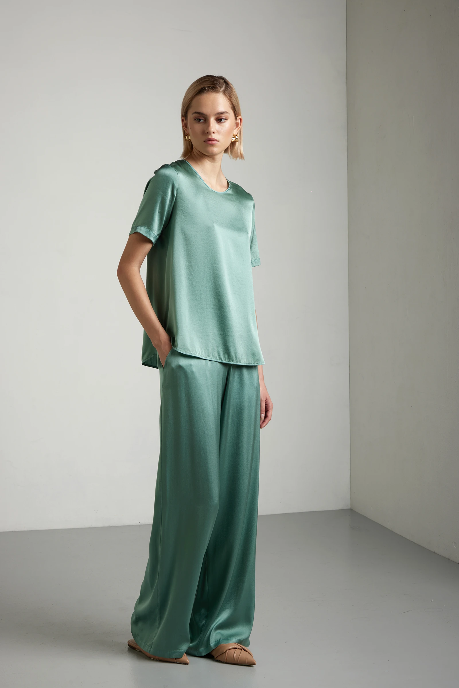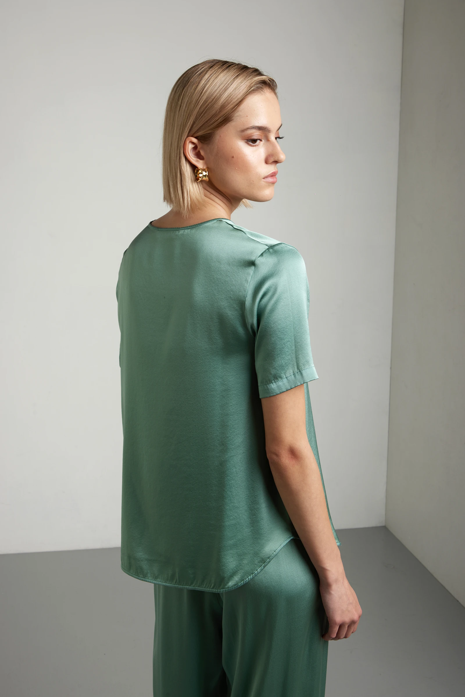 Girocollo manica corta realizzato in satin di seta stretch, dalla superficie liscia e luminosa.Il tessuto in satin valorizza la naturale brillantezza della seta, mentre la componente elasticizzata garantisce comfort e vestibilità fluida. La linea dritta mantiene proporzioni pulite e contemporanee, senza eccessi di volume.Il fondo leggermente stondato alleggerisce la silhouette e migliora la portabilità, sia indossata morbida sia leggermente rimborsata.Un capo raffinato e versatile, costruito per offrire leggerezza, movimento e una presenza discreta ma distintiva.