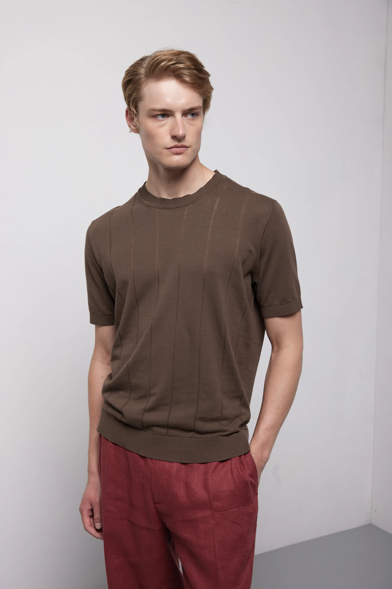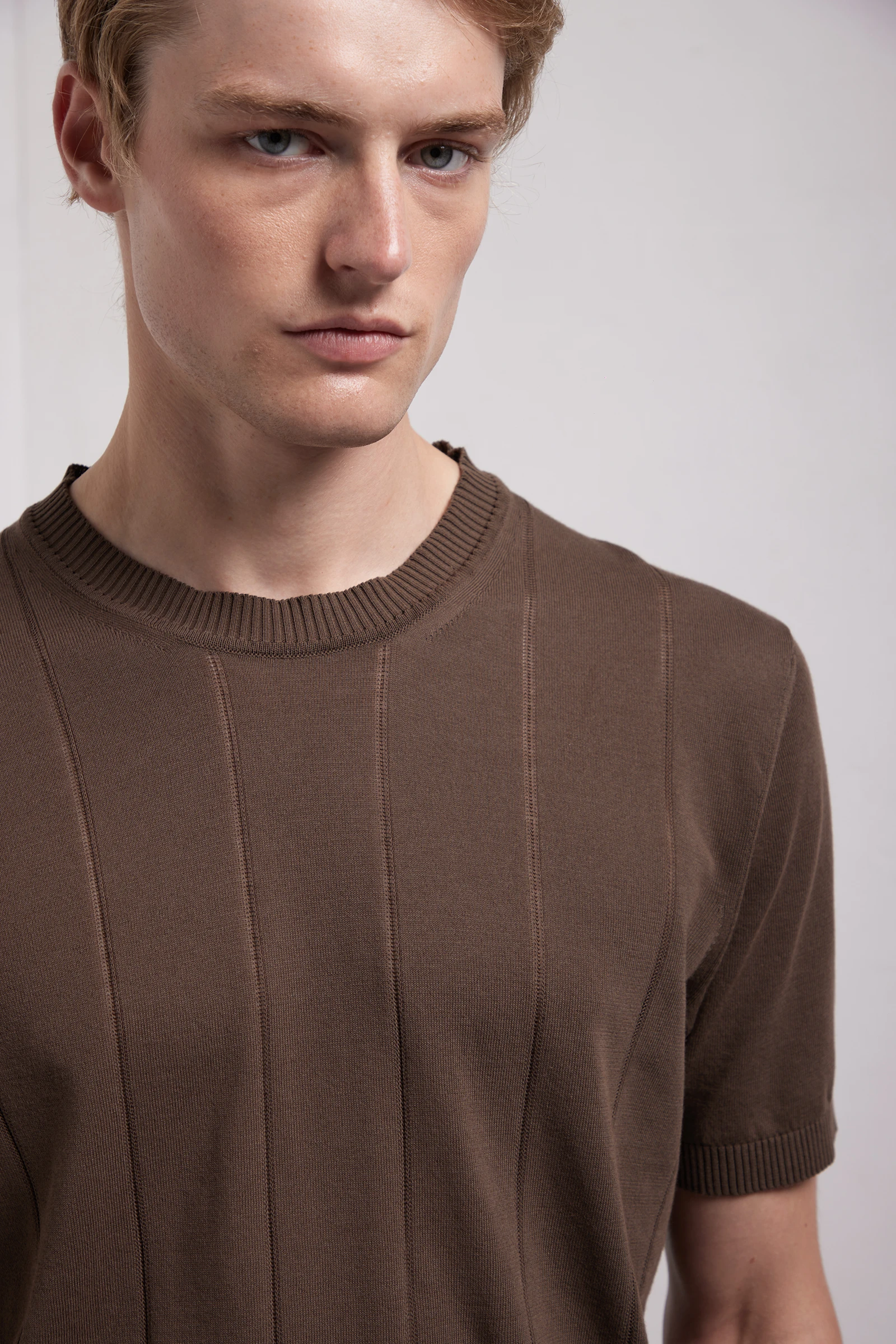 Girocollo a manica corta in puro cotone, realizzato su finezza 14 per una struttura più compatta e consistente. Il davanti è valorizzato da una fantasia di coste piatte che crea un effetto grafico ordinato e contemporaneo, donando profondità senza appesantire la linea.