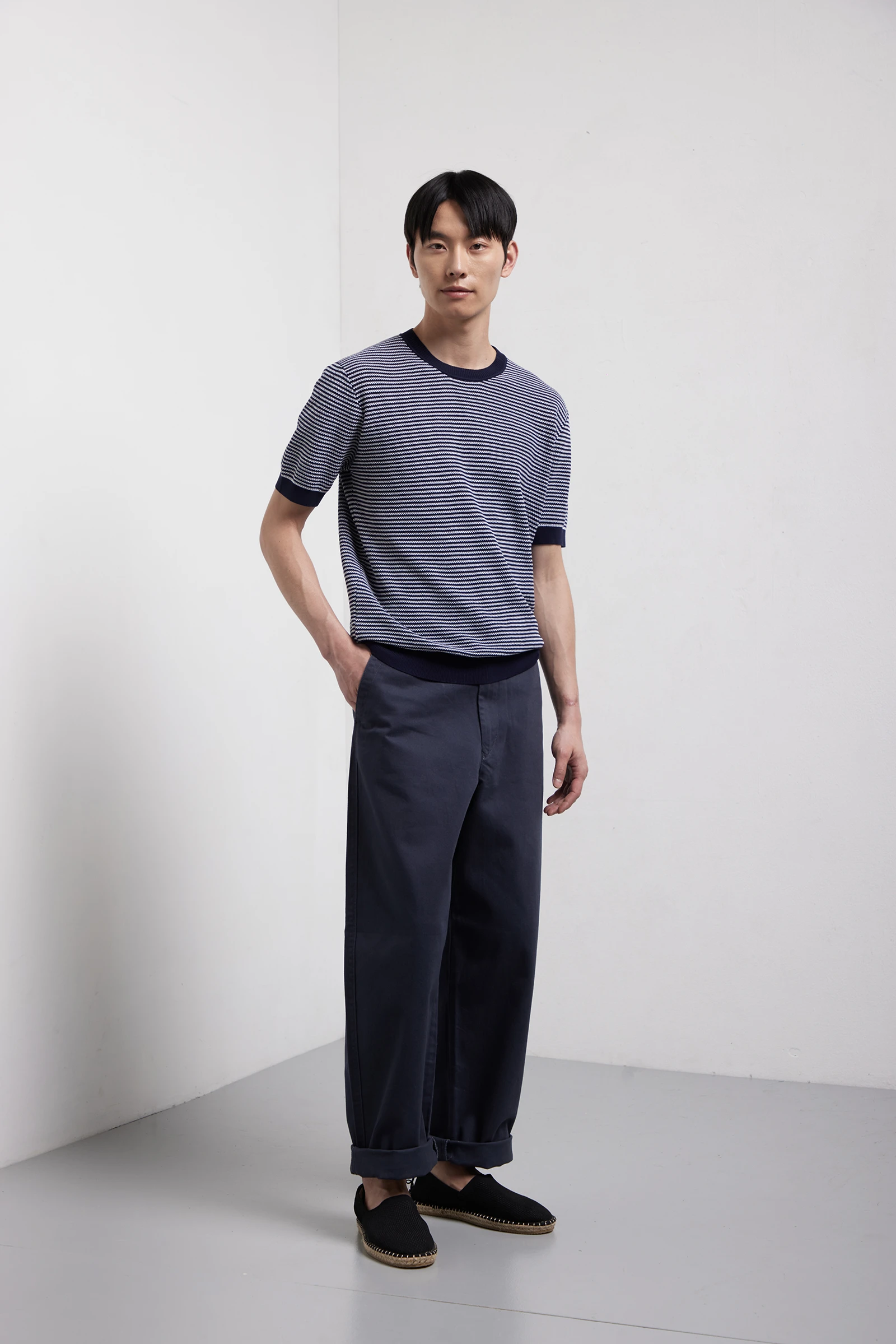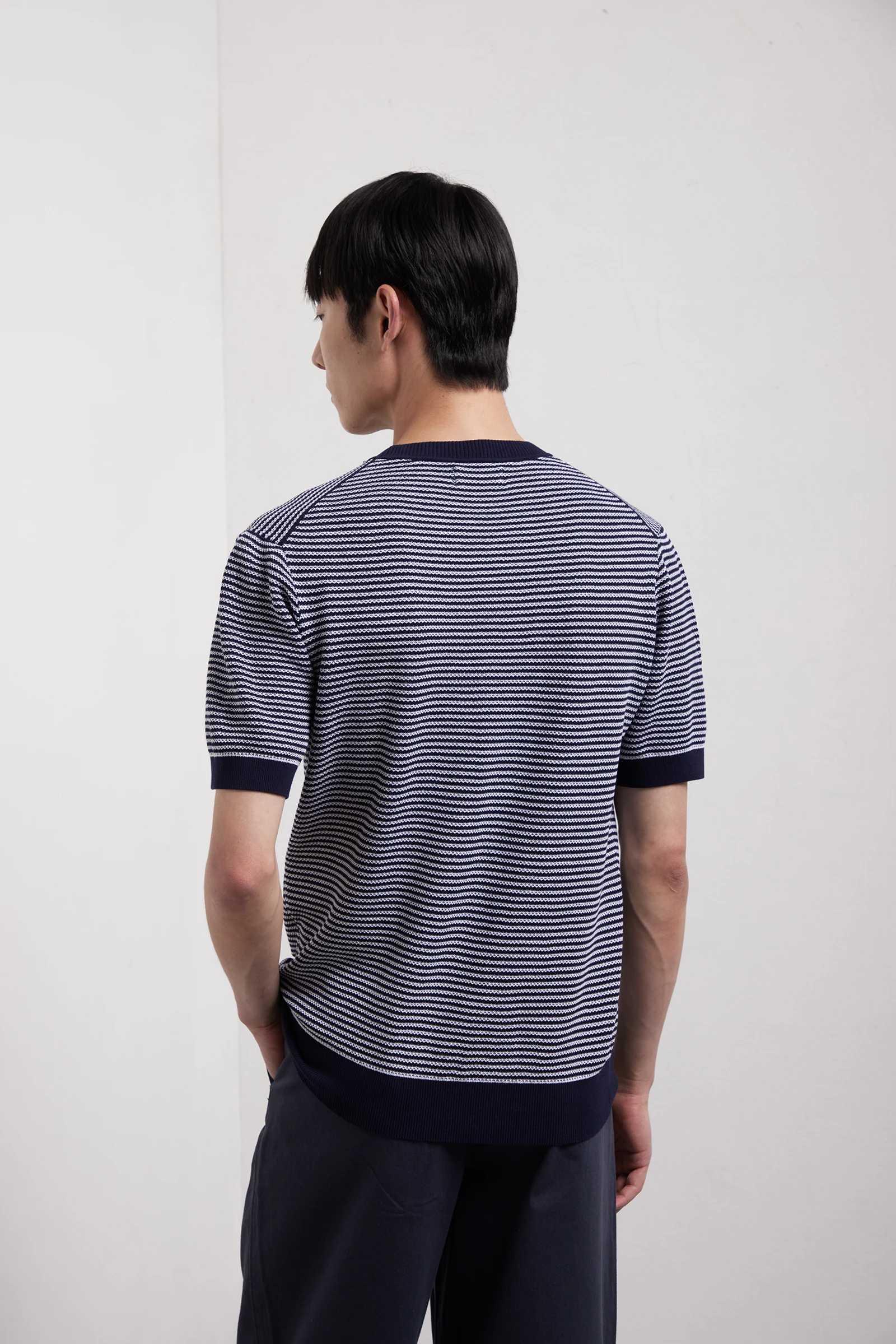 Girocollo a manica corta in puro cotone, caratterizzato da lavorazione rigata bicolore che dona ritmo visivo e personalità al capo. La struttura della maglia mantiene una mano fresca e confortevole, ideale per la stagione primavera/estate. Le finiture a contrasto su collo, fondo manica e fondo capo valorizzano il design con un dettaglio deciso ma equilibrato. Un modello versatile, perfetto per look casual curati o abbinamenti più raffinati sotto una giacca leggera.