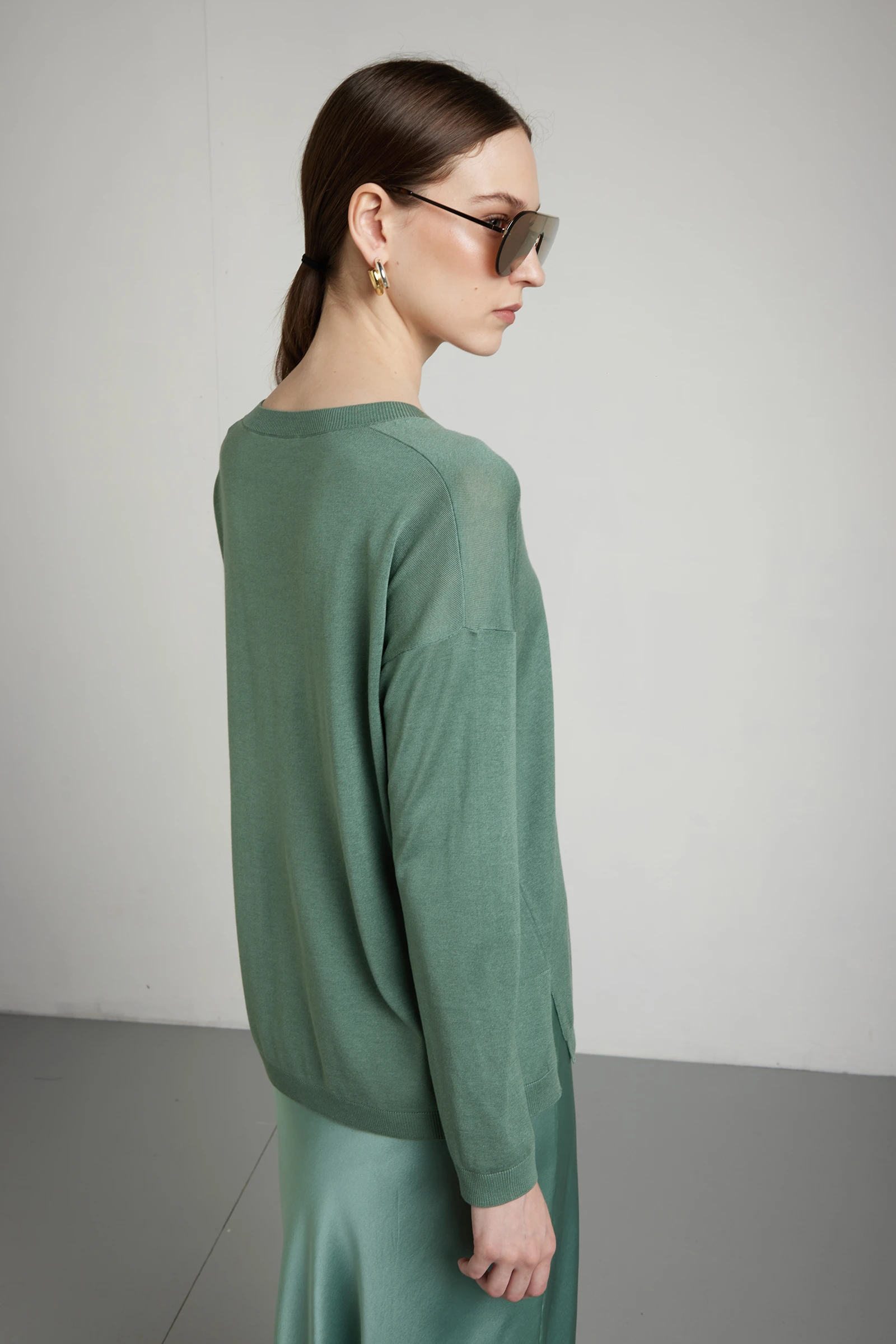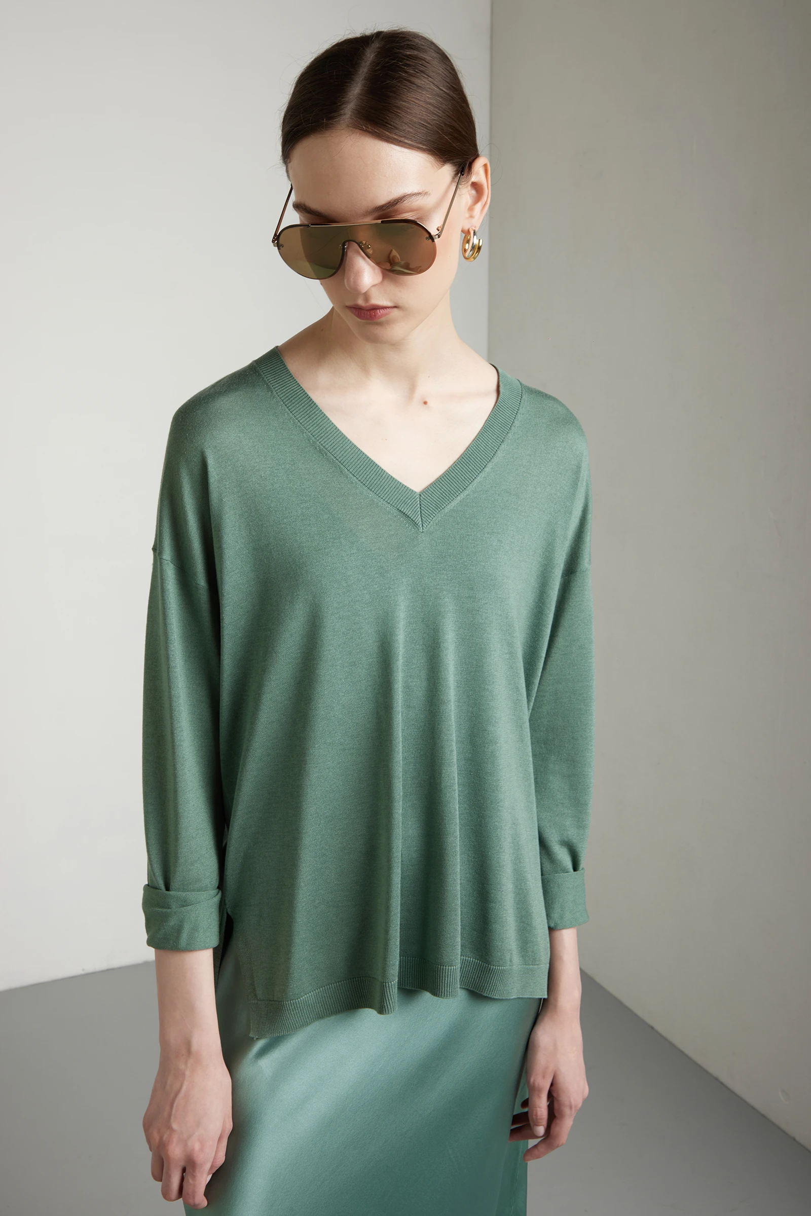Maglia scollo a V dalla linea oversize, realizzata in pregiato filato seta-cashmere, dalla lavorazione rasata, su finezza 16, per una superficie liscia, compatta e raffinata. La costruzione con spalla scesa e manica lunga crea un volume morbido e contemporaneo, mantenendo eleganza e leggerezza. Gli spacchi laterali alleggeriscono la silhouette e donano movimento, valorizzando la vestibilità ampia. La combinazione di seta e cashmere assicura luminosità naturale, morbidezza superiore e comfort sulla pelle. Un capo sofisticato ed essenziale, ideale per look ricercati ma disinvolti.