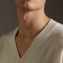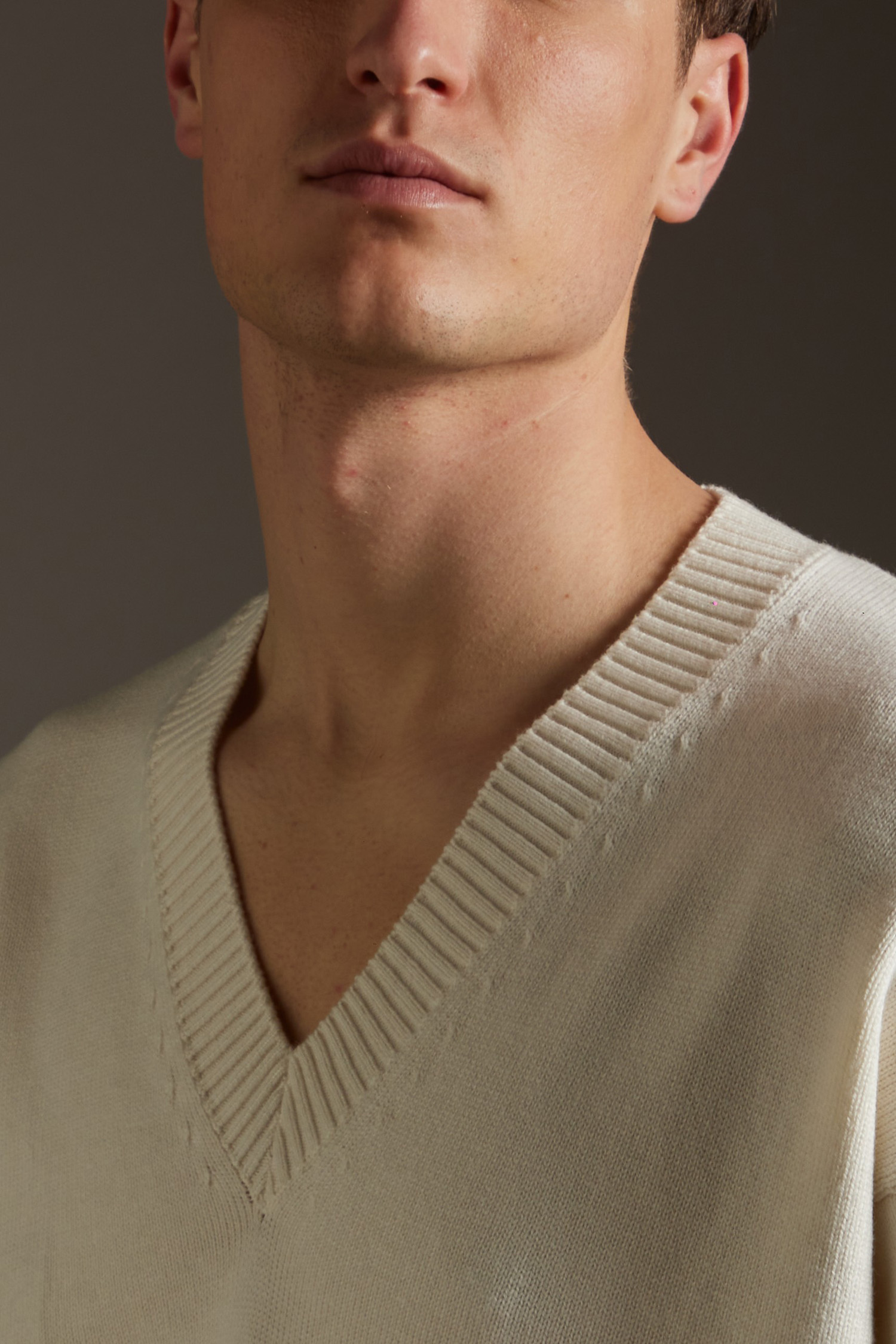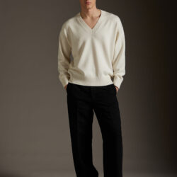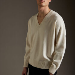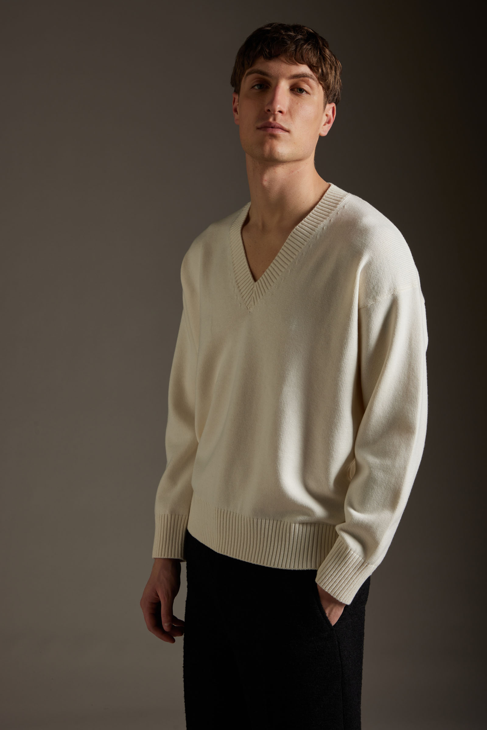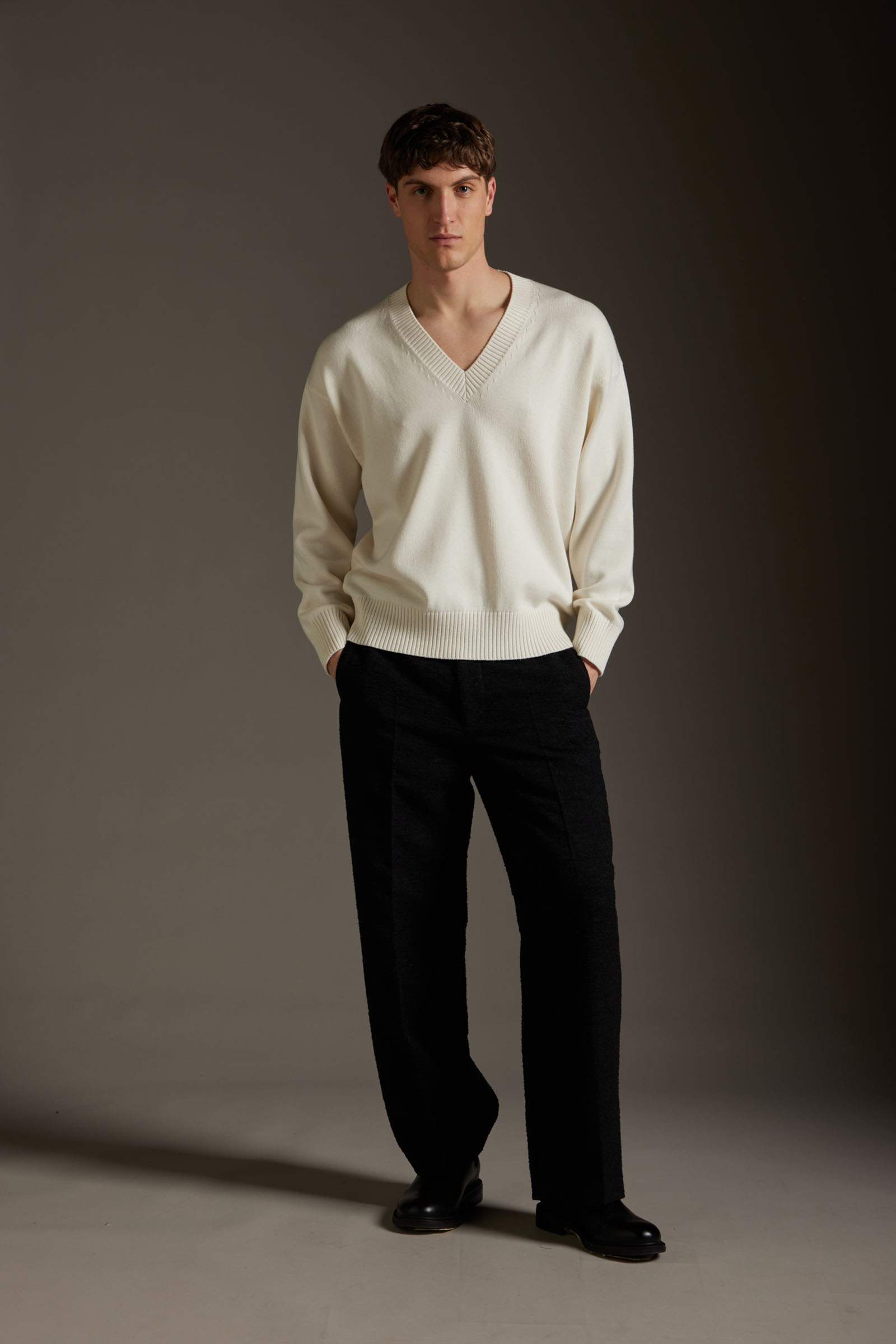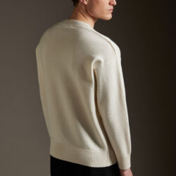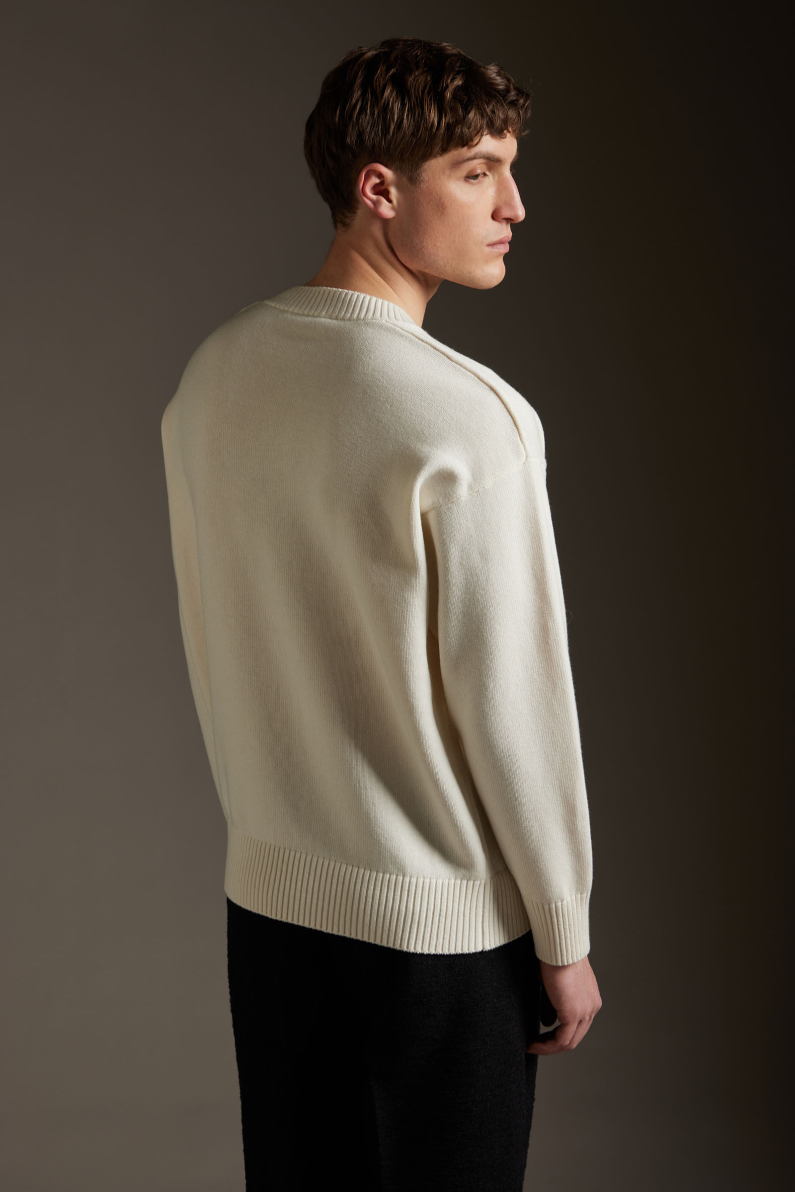 Pullover rasato calato, realizzato su finezza 7 a più fili in misto Lana/Cotone dall’aspetto caldo e compatto, vestibilità over con spalla scesa , con fondo polsi e collo a costine