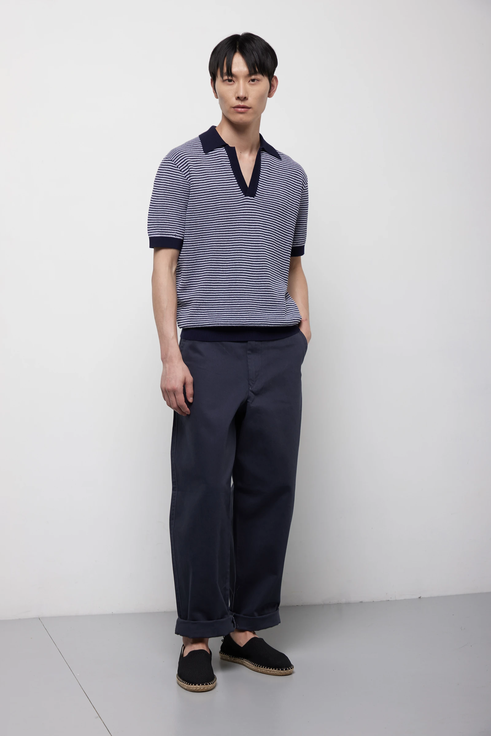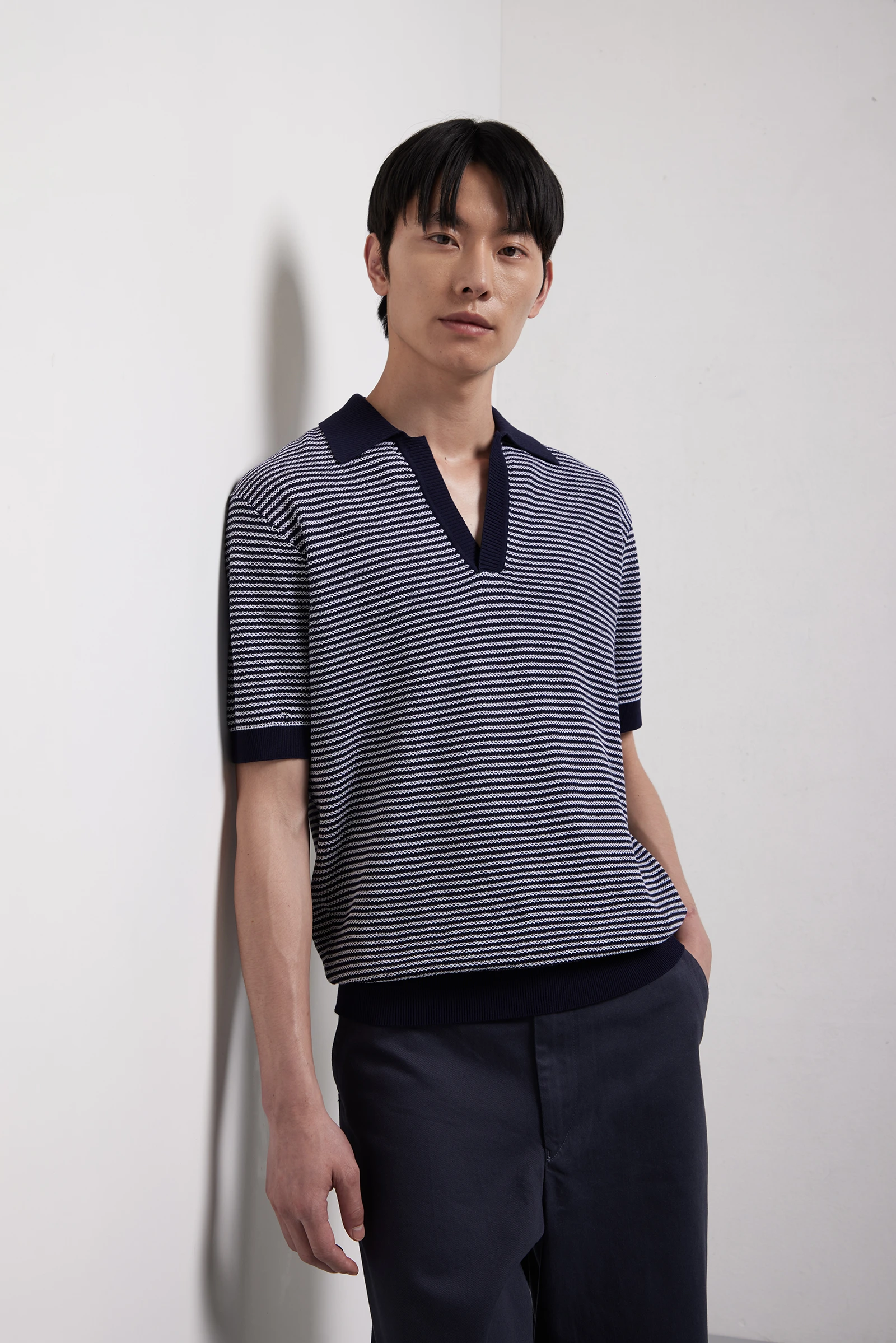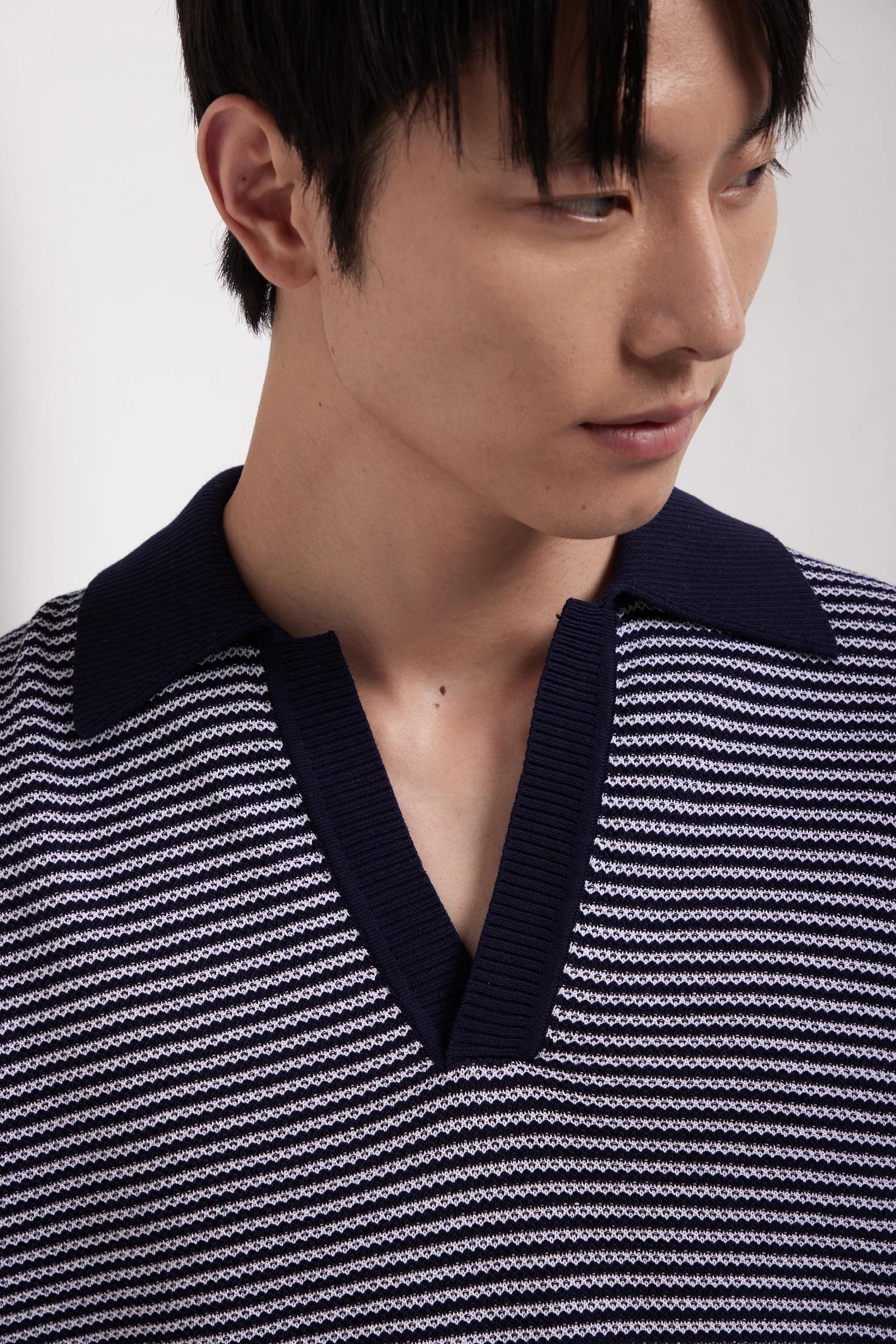 Polo senza bottoni a manica corta in puro cotone, dove la lavorazione rigata bicolore crea un gioco grafico raffinato e dinamico. Il contrasto cromatico dona carattere al capo mantenendo equilibrio e pulizia formale. La linea essenziale, priva di abbottonatura, rende il design moderno e disinvolto, mentre le finiture a contrasto definiscono i dettagli con precisione. Un capo fresco, leggero e distintivo, pensato per la stagione estiva e per chi cerca una maglia che si faccia notare con discrezione.