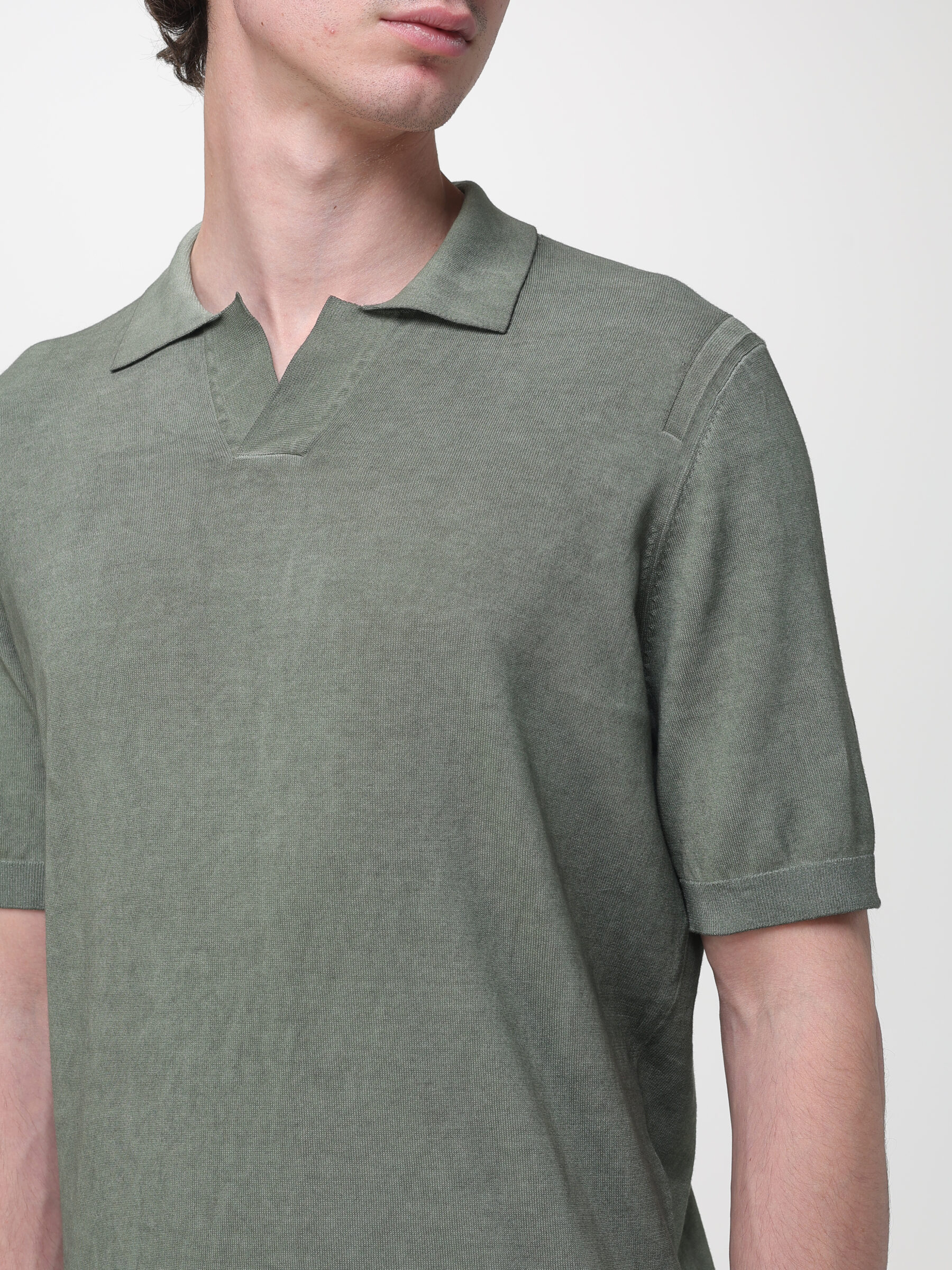 Polo ssenza bottoni a manica corta in cotone, valorizzato da un trattamento vintage che dona al capo un aspetto leggermente vissuto e una profondità cromatica naturale. Il colore acquista sfumature e carattere, rendendo ogni capo unico nelle sue leggere variazioni.