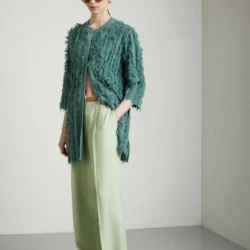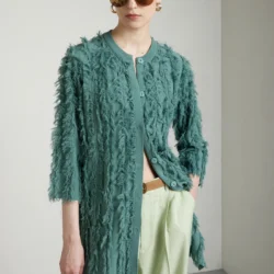 Spolverino scollo a coreana, in puro cotone, realizzato in finezza 14, caratterizzato da una raffinata lavorazione a frangette che crea movimento sulla superficie. La linea è fluida e verticale, pensata per slanciare la silhouette mantenendo leggerezza e comfort. Gli spacchi laterali donano dinamismo e facilitano la vestibilità, mentre la chiusura interna con automatici mantiene l’estetica pulita e minimale. Un capo distintivo e contemporaneo, ideale come strato leggero per completare look primaverili con personalità e ricercatezza.