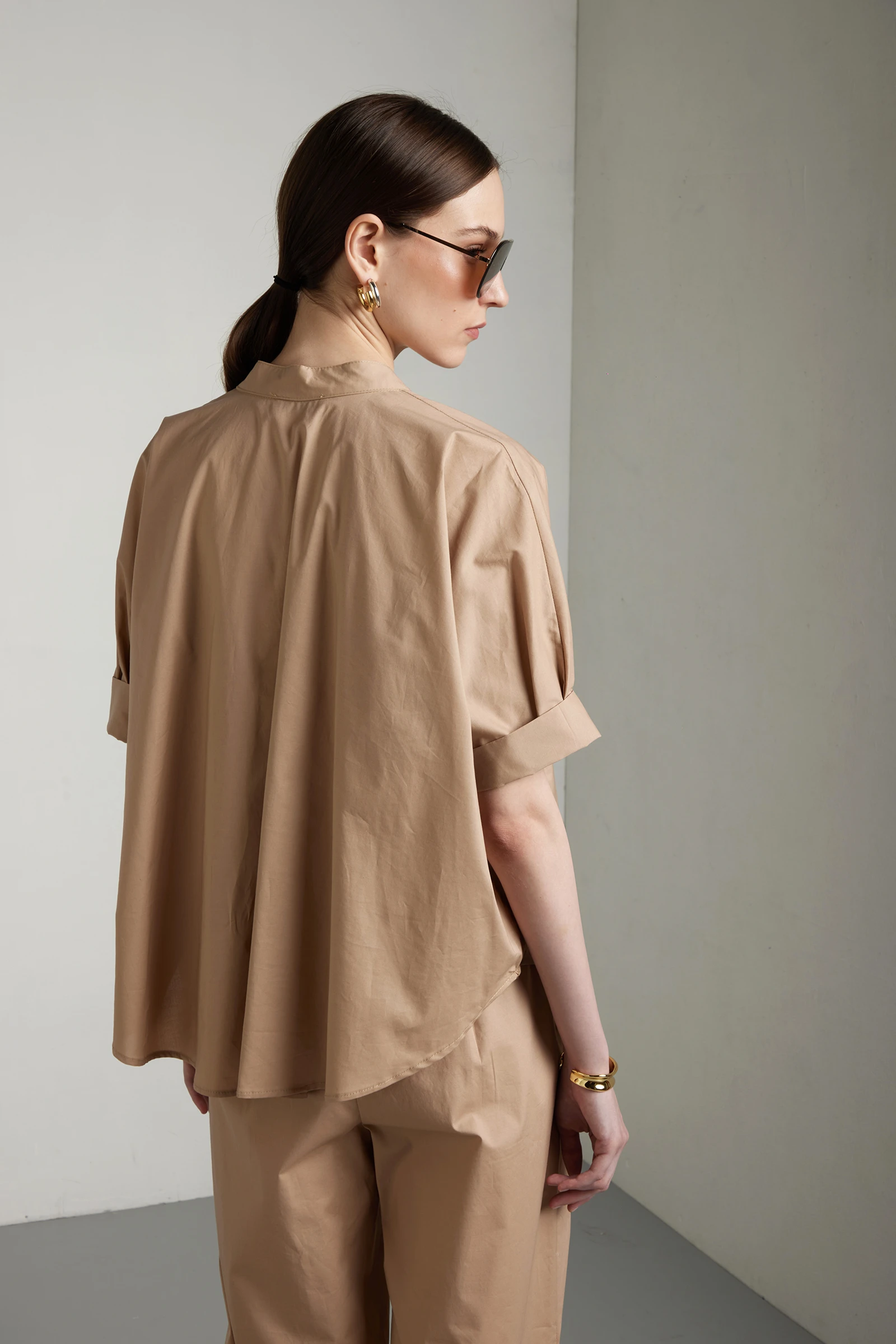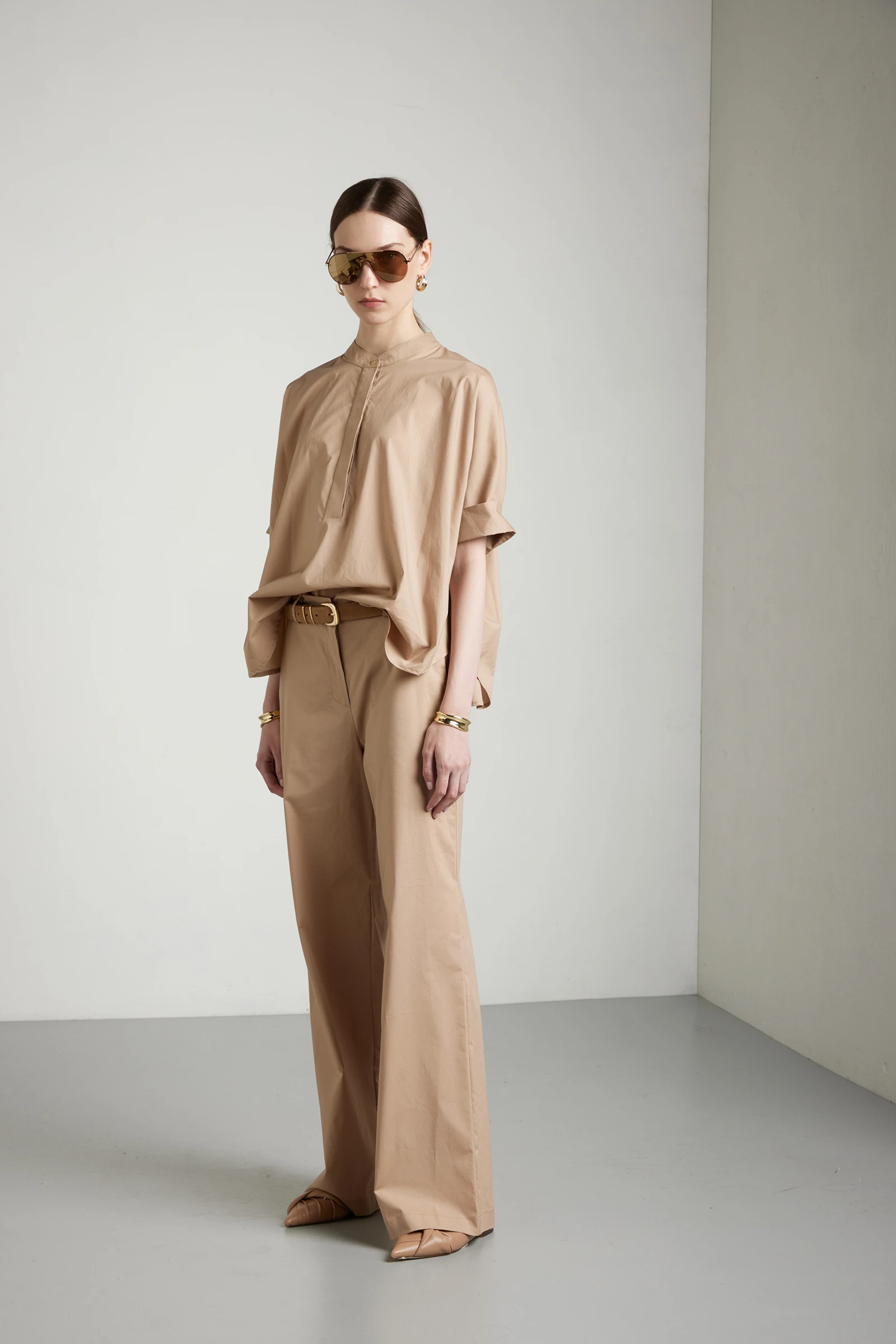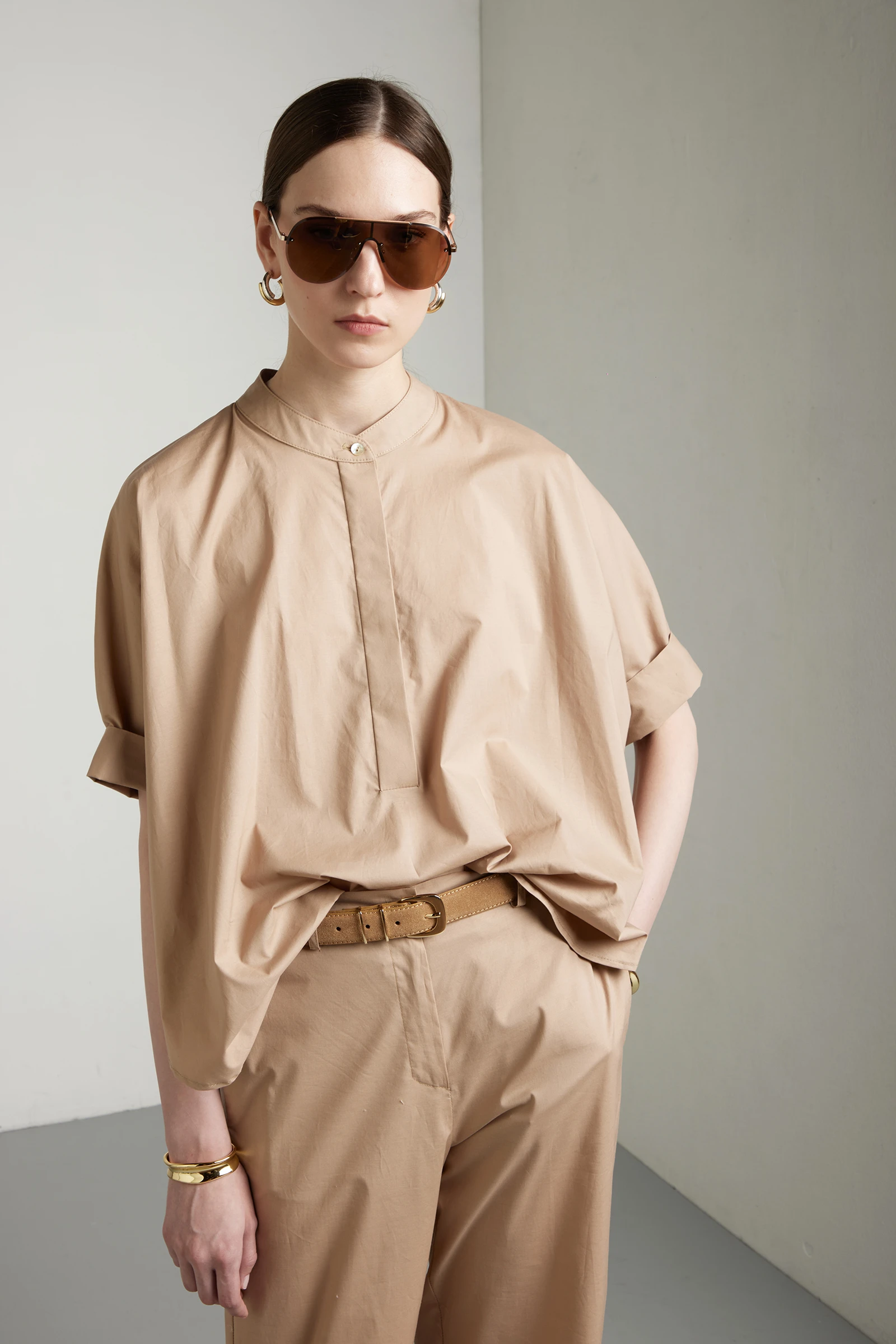 Oversized shirt with a Serafino neckline and concealed internal buttons, made from stretch cotton poplin. The poplin ensures a fresh, compact hand feel, while the oversized fit offers soft, contemporary volumes. The slightly rounded hem lightens the silhouette and enhances wearability both tucked in and worn loose.